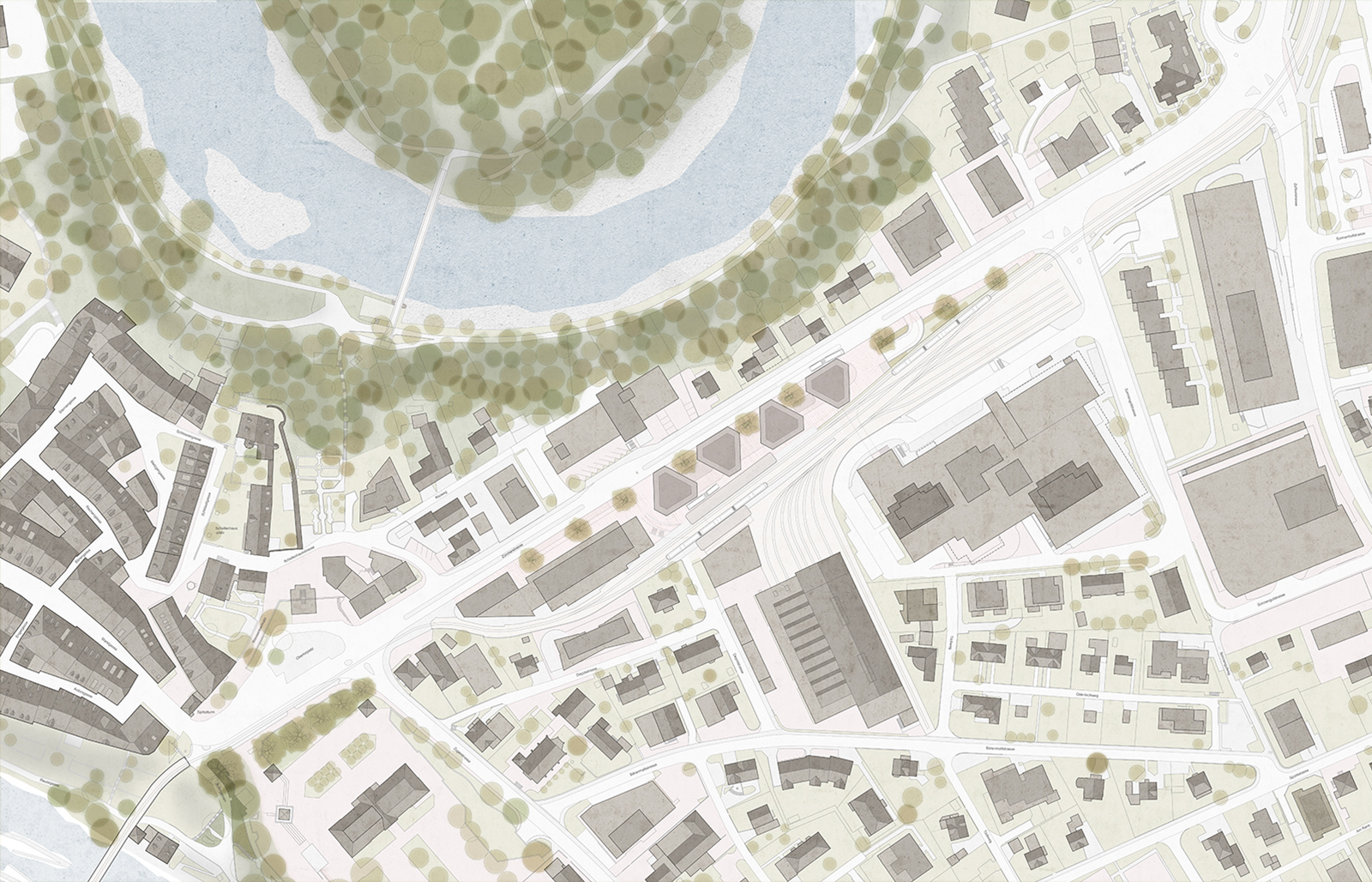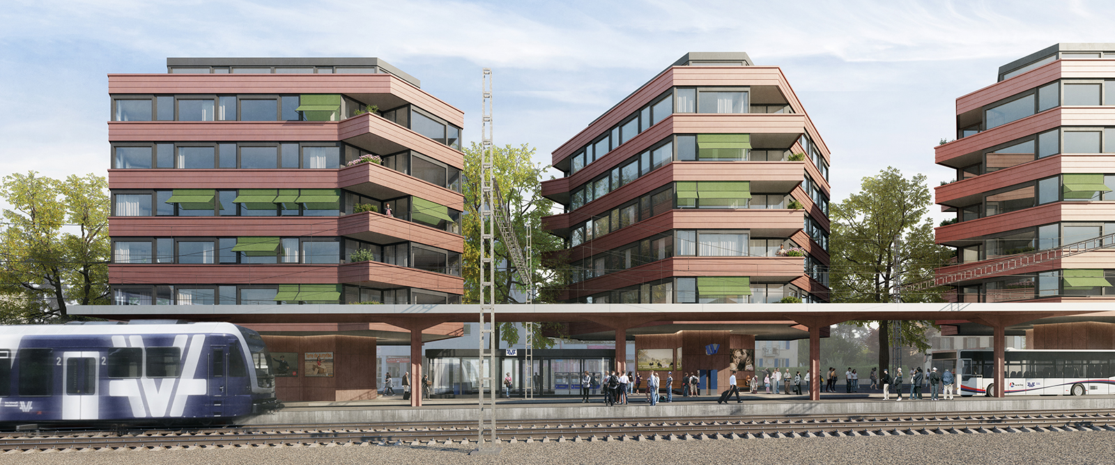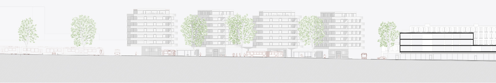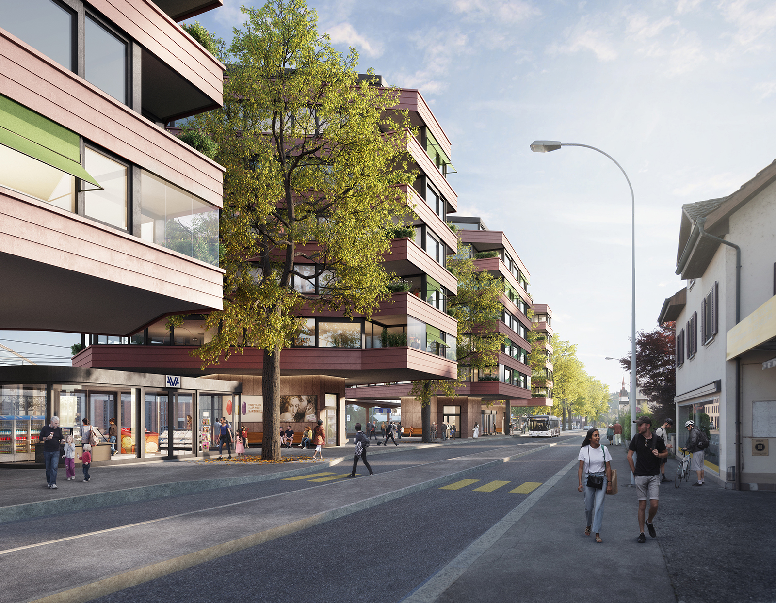 Diese beiden Charakteristiken des Orts – die Reihe der Häuser an der Strasse und die Reihen der Bäume in der Landschaft - werden zum Ausgangspunkt des Entwurfs: Die Zürcherstrasse wird zum Boulevard im Schatten der Alleebäume, deren Zwischenräume von Häusern besiedelt werden. So bleibt die Bebauung durchlässig, und trotzdem wird der Strassenraum gefasst.Eigentlich ähneln auch die Häuser selbst Bäumen: Über ihrem schmalen Stamm erhebt sich eine weit auskragende Krone, die möglichst vielen Menschen Schutz und Schatten gewährt, während in den Kronen selber gewohnt und gearbeitet wird.
