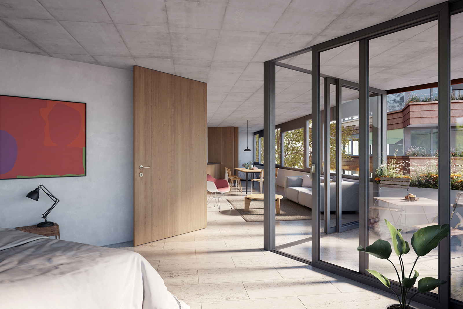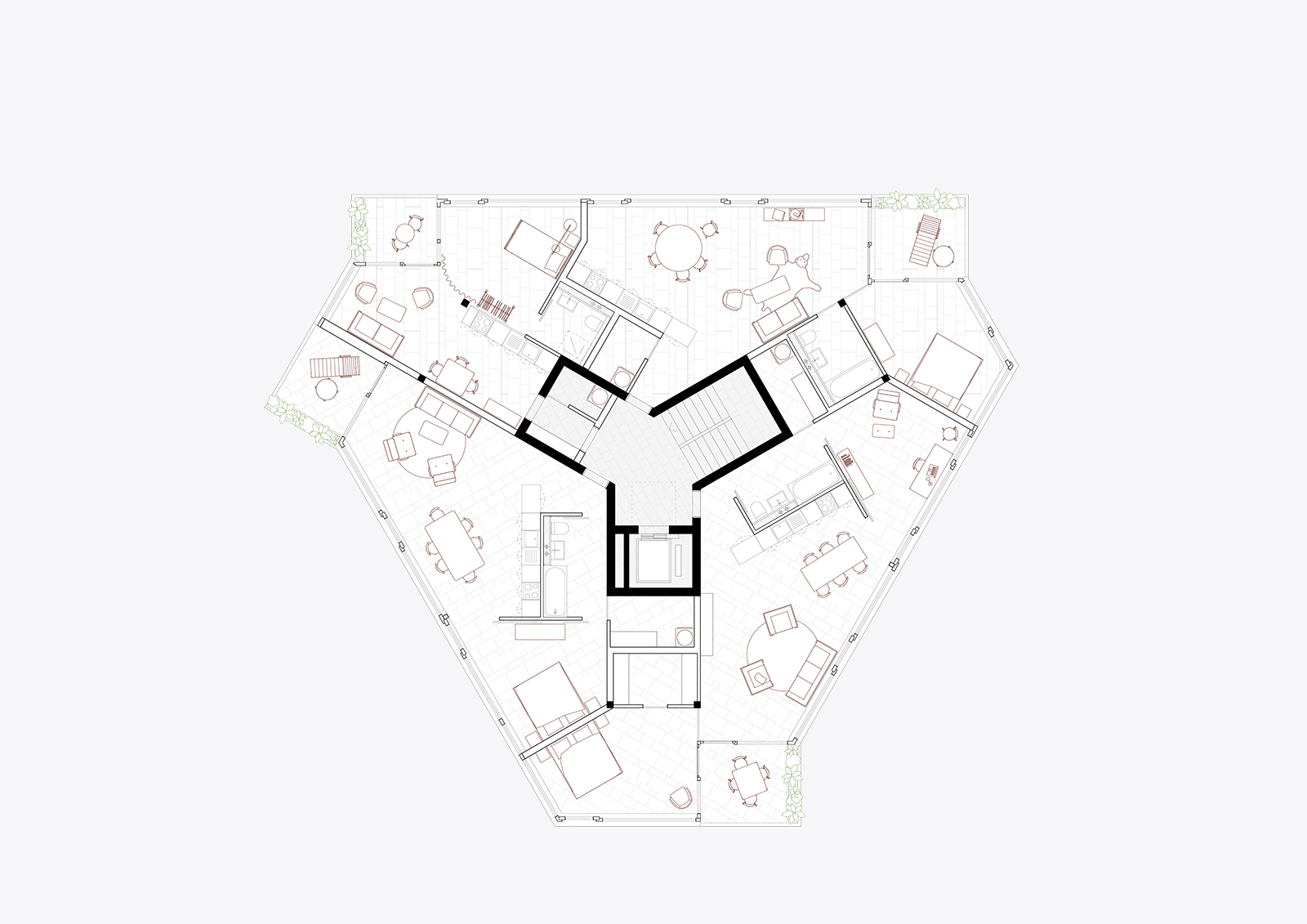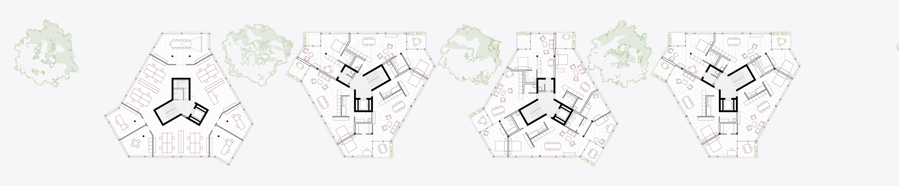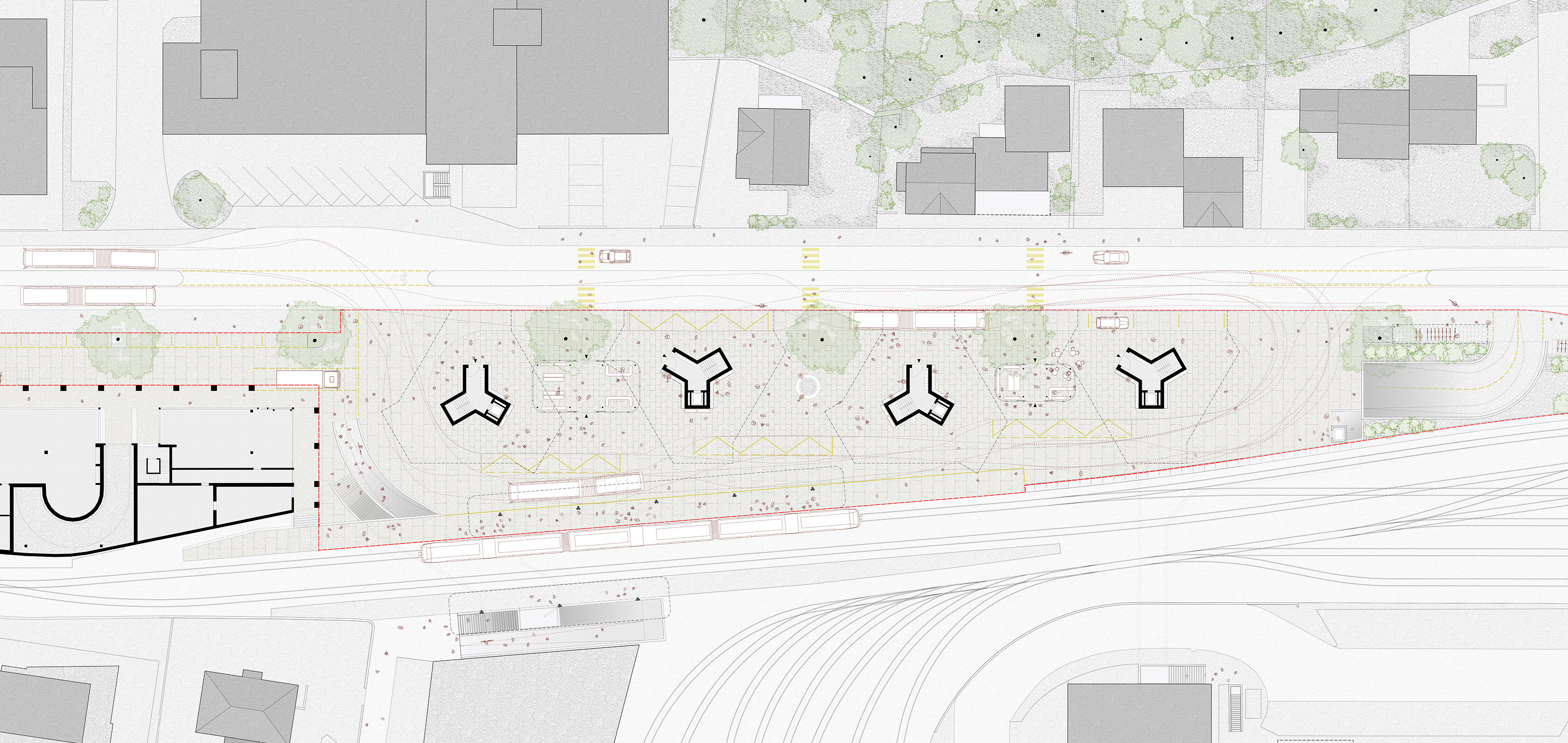 Diese beiden Charakteristiken des Orts – die Reihe der Häuser an der Strasse und die Reihen der Bäume in der Landschaft - werden zum Ausgangspunkt des Entwurfs: Die Zürcherstrasse wird zum Boulevard im Schatten der Alleebäume, deren Zwischenräume von Häusern besiedelt werden. So bleibt die Bebauung durchlässig, und trotzdem wird der Strassenraum gefasst.Eigentlich ähneln auch die Häuser selbst Bäumen: Über ihrem schmalen Stamm erhebt sich eine weit auskragende Krone, die möglichst vielen Menschen Schutz und Schatten gewährt, während in den Kronen selber gewohnt und gearbeitet wird.