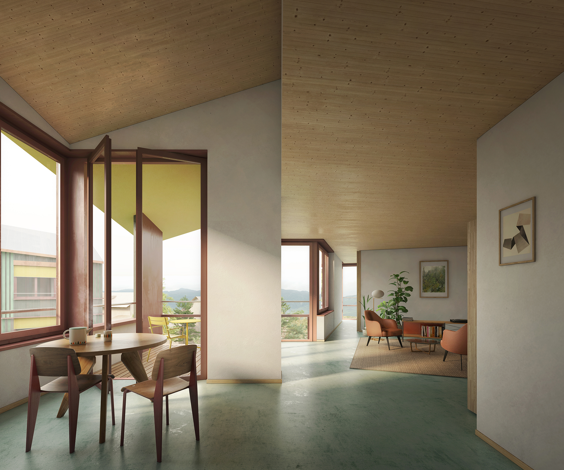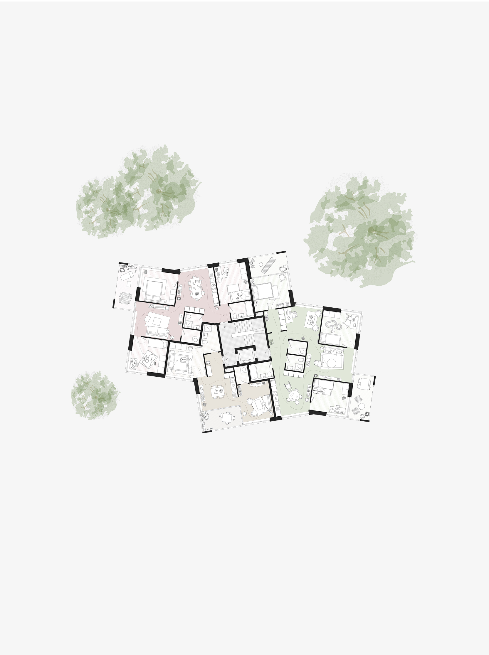 Die Modulation des Baukörpers bewirkt im Innern die Abdrehung der Erschliessungskerne. Diese stabilisieren die Gebäude nicht nur technisch-konstruktiv, sondern auch räumlich, indem sie die dienenden Räume und Schlafzimmer zu orthogonal strukturierten Clustern ordnen. Zwischen diesen orthogonalen Clustern vermitteln die Wohn- und Essbereiche als weich fliessende Raumfolge. Die Abdrehung der Kerne zueinander formt diese Raumfolge zu einem ‚atmenden’ Gefüge, in dem sich Aufweitungen und Einschnürungen abwechseln.