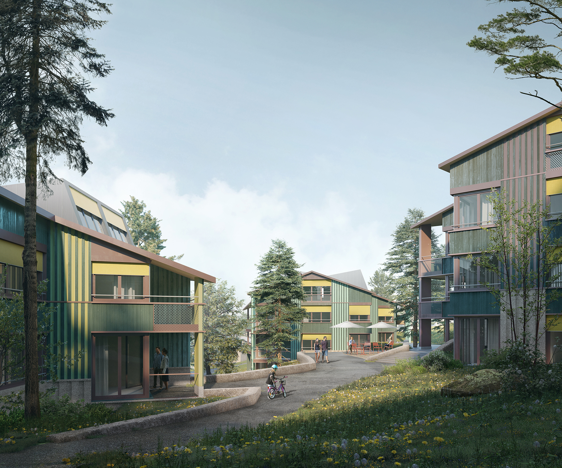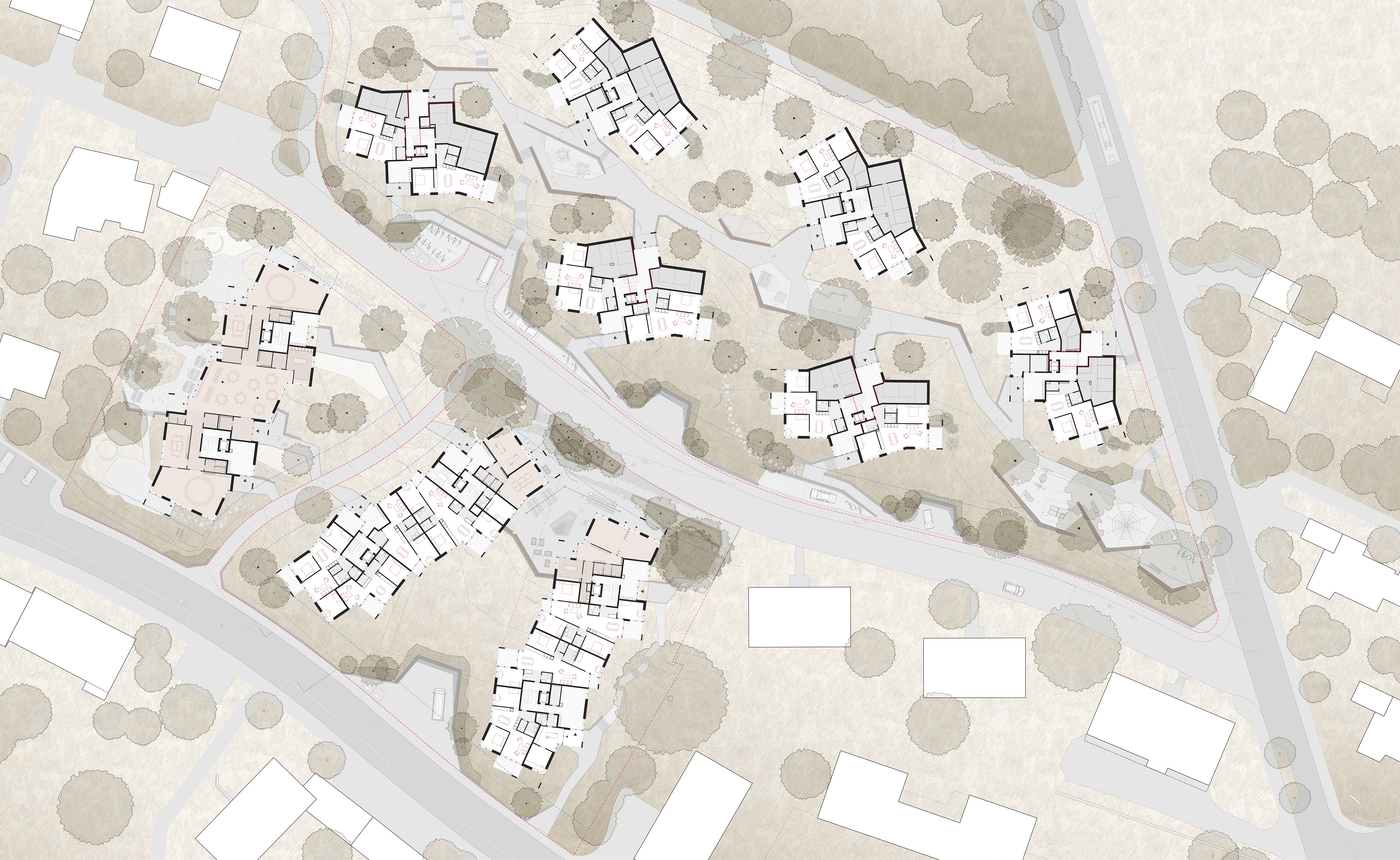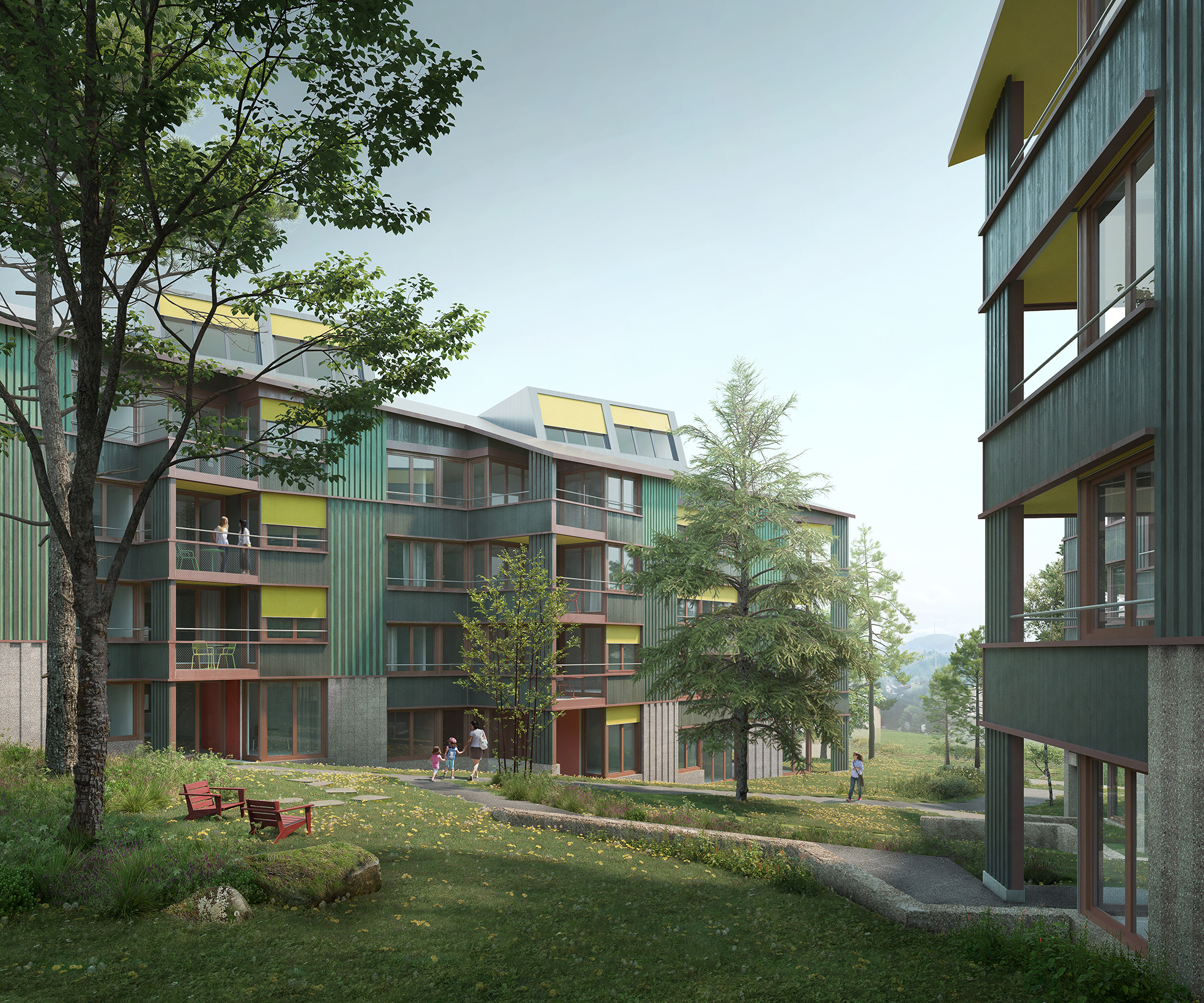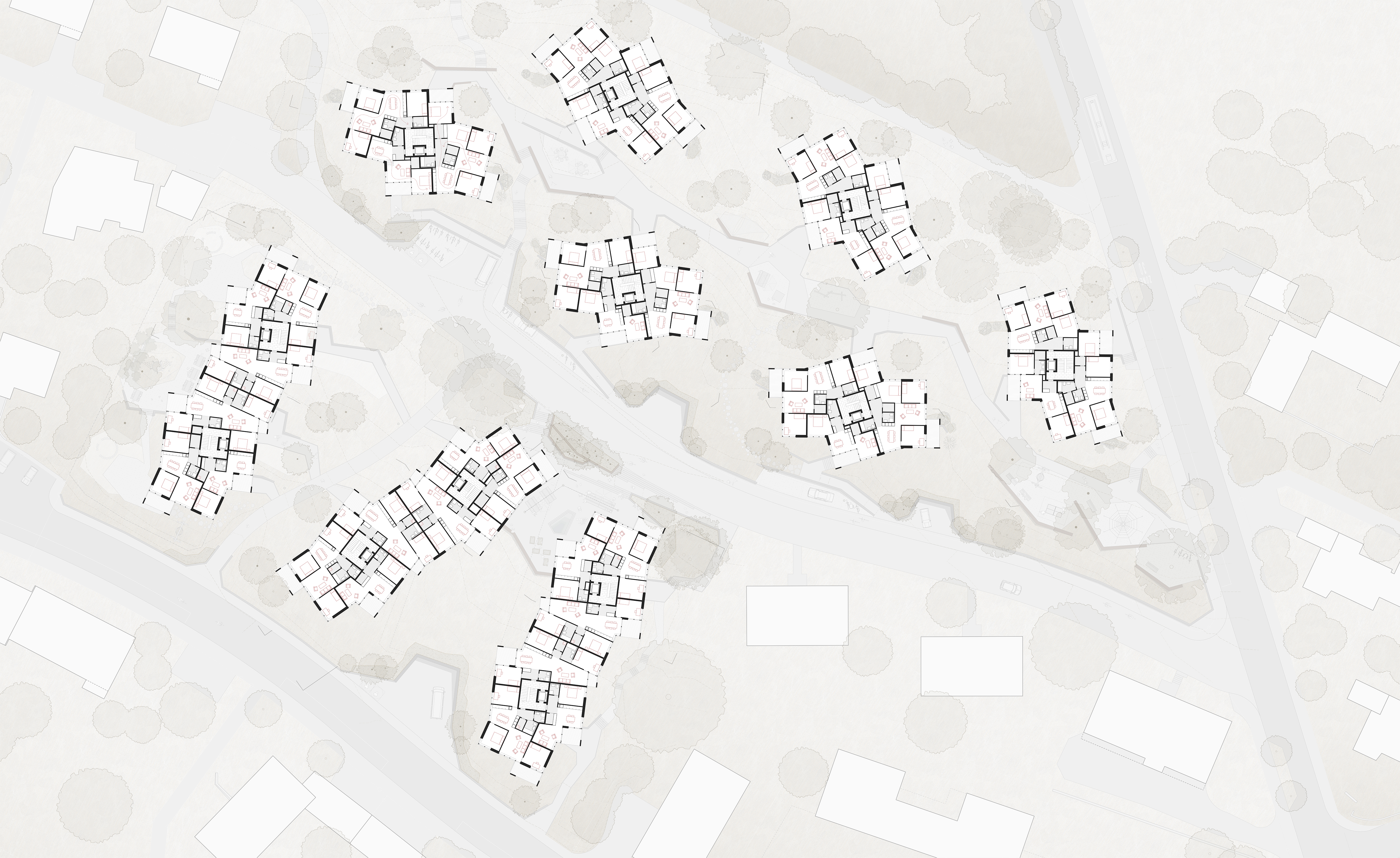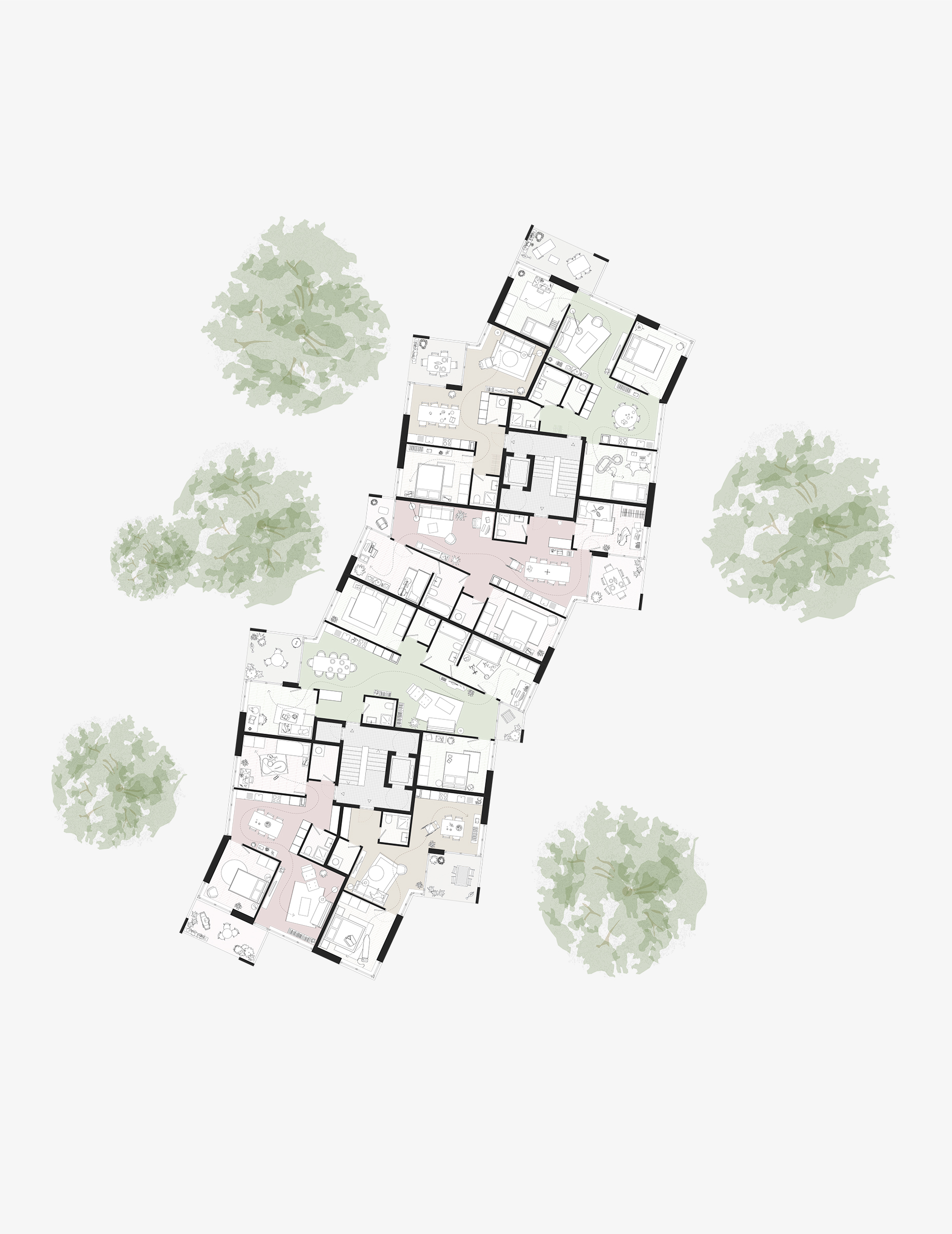 Wie vermittelt man an diesem Ort - am Übergang von der Stadt aufs Land, zwischen Lärchen und Föhren - ein Gefühl vom „Wohnen in den Baumkronen“? Durch grosse, ins Grüne ausgreifende Balkone, eigentliche Baumhäuser... Deshalb sind die Gebäudezeilen schuppenartig aufgefächert, wie die geöffneten Schuppen von Tannenzapfen. In jedem Vorsprung findet ein übereck orientierter Balkon Platz, der soviel Aussicht und zugleich Schutz bietet wie keine andere Balkonform. Weil die Baukörper aufgespreizt sind, wird ausserdem das direkte, starre Vis-à-Vis mit dem Nachbarn vermieden und stattdessen der Blick in die Tiefe des Siedlungsraums umgeleitet.
