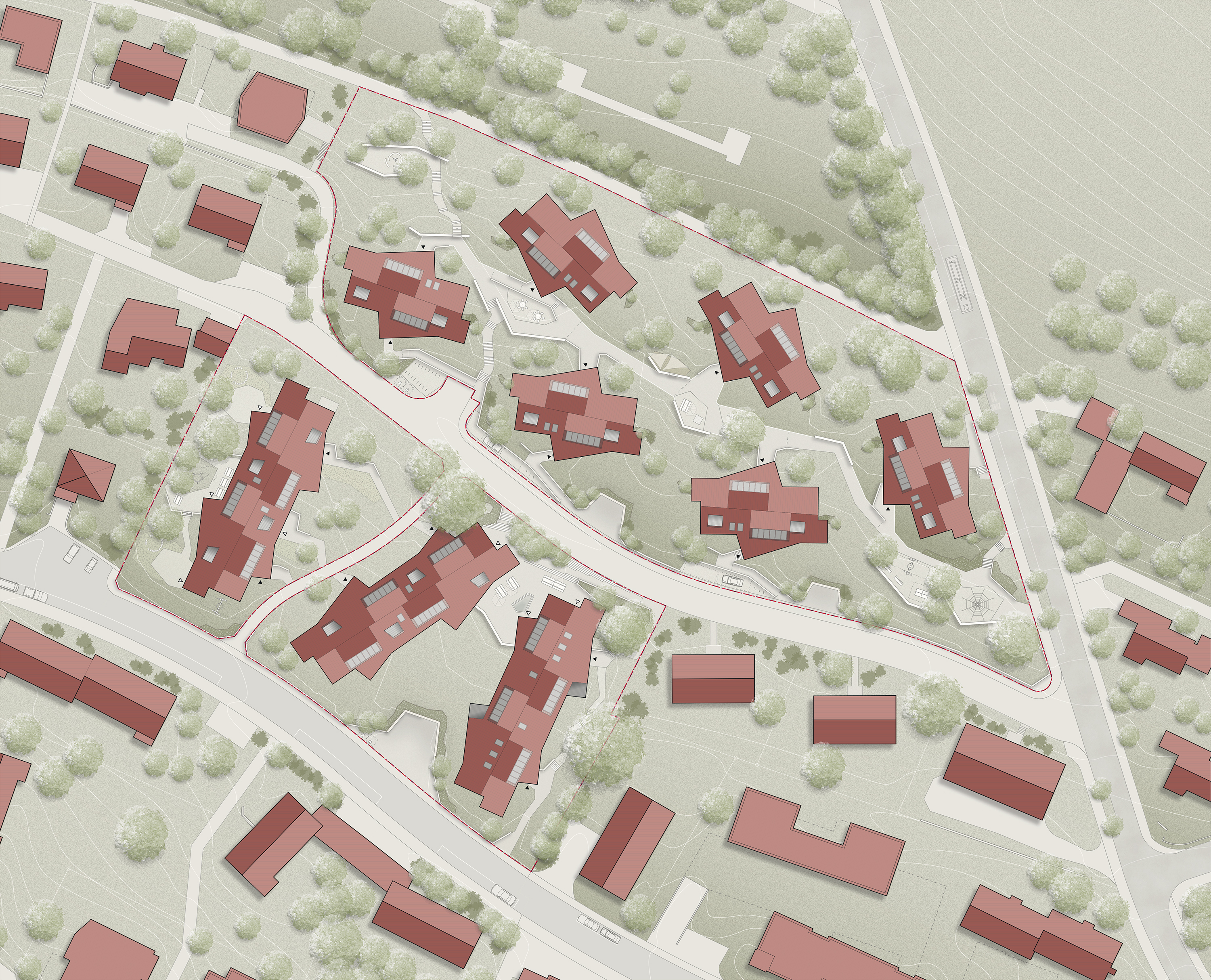 Die grösseren Baukörper im südlichen Baufeld stehen Zick-Zack-förmig zueinander. Dadurch öffnen sich die Zwischenräume - mal talwärts, mal bergwärts – und es werden konfrontative Vis-à-Vis zwischen den Gebäudezeilen vermieden. Die kleineren Baukörper im nördlichen Baufeld sind dagegen reissverschlussartig – RiRi eben – zueinander versetzt. Dadurch entsteht eine zwanglose Ordnung, die den grossen landschaftlichen Zusammenhang nicht stört, sondern umspielt.