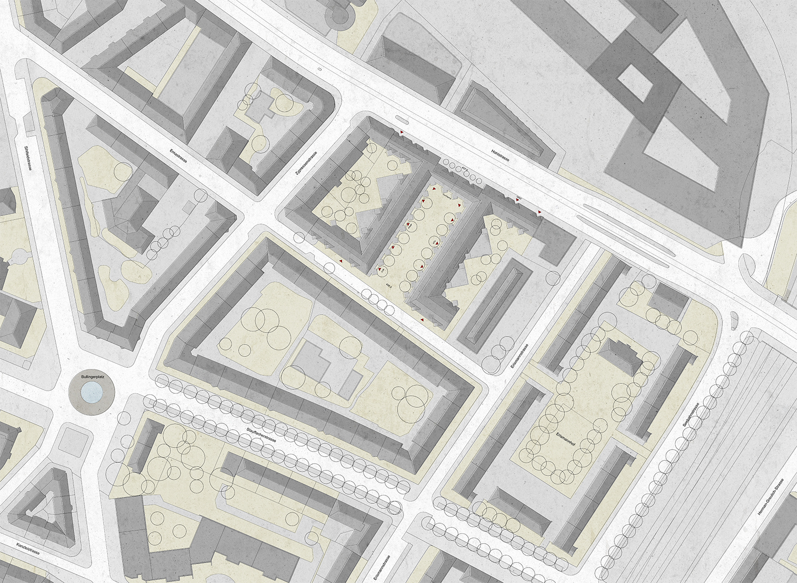 Am Verkehrsinfarkt der Hohlstrasse kann auch die beste Architektur nichts ändern. Davon abgesehen gibt es am Stüdliweg städtebaulich nicht viel zu klären - ein wenig Justieren reicht schon. Denn der Hofraum am Stüdliweg ist in seiner heutigen Form angenehm und gut proportioniert - bloss wenig angeeignet, weil er etwas abseits liegt. Darum wird hier vorgeschlagen, zur Ernastrasse hin den mittleren Hofraum auf ganzer Breite zu öffnen, so dass hier ein echter Siedlungsplatz entstehen kann, dessen gemeinschaftliches Leben bis auf die Ernastrasse hinaus abstrahlt und zur Hohlstrasse hin einen ‚Ehrenhof’ anzudeuten. Mit dem Mittelrisalit, der hinter einer Gruppe schlanker Bäume leicht zurückversetzt ist, wird die Zuwendung zum öffentlichen Raum gestisch bezeichnet und ein freundlicher Ort inmitten der Verkehrsschneise angelegt.