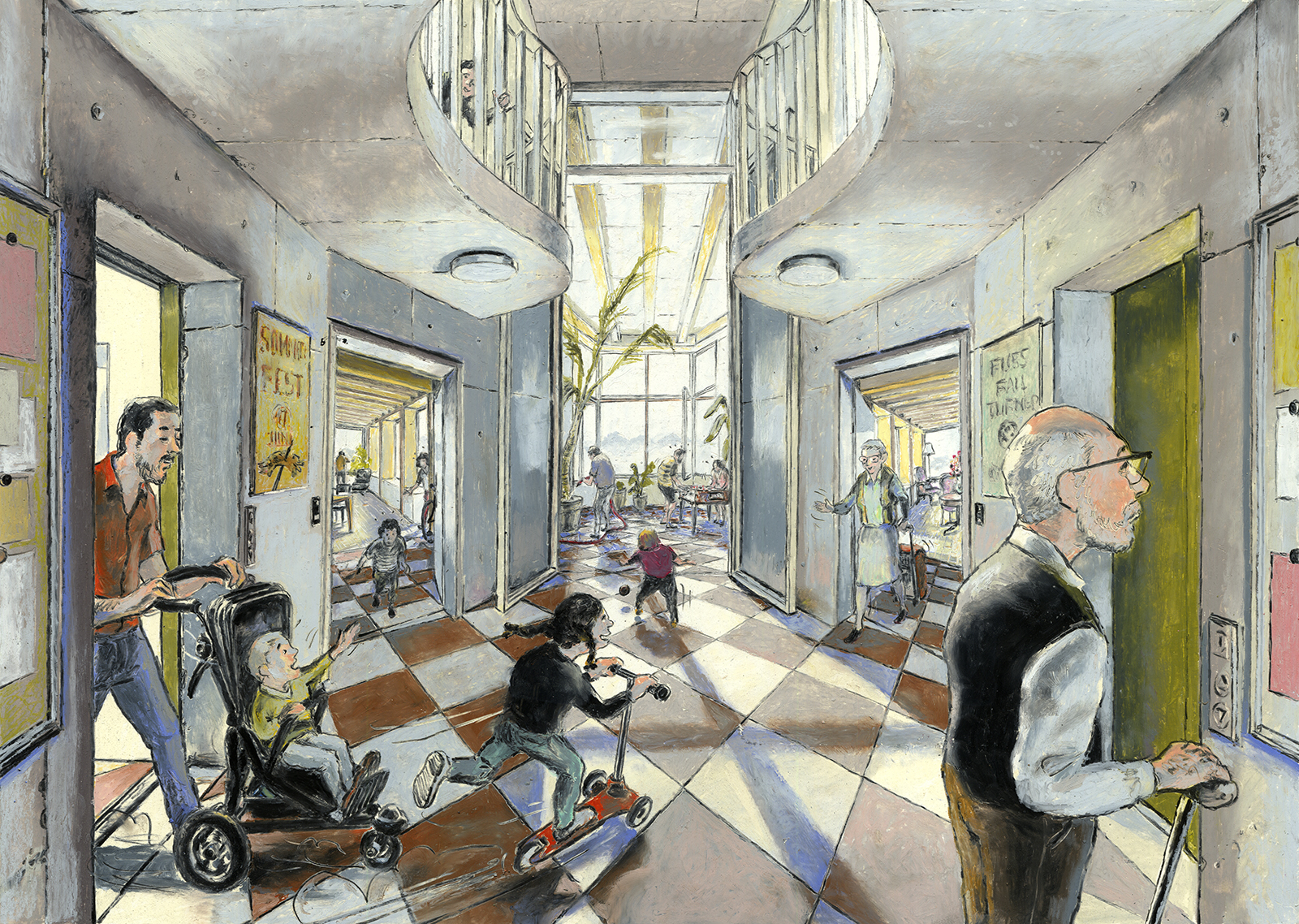 Es sind nicht die grossen Anlässe an besonderen Tagen, welche Nachbarn zu Freunden werden lassen, sondern es sind die kleinen, kurzen Begegnungen im Alltag. Viel wichtiger als Spa-Oasen auf dem Dach oder weite Festsäle im Parterre sind darum die Begegnungen vor der Wohnungstür. Um diese zu fördern, schlagen wir Nachbarschaften aus acht Wohnungen vor, welche sich eine doppelgeschossige Halle teilen. Erst mit der Gruppierung jeweils zweier Geschosse kommen genügend Nachbarn zusammen.