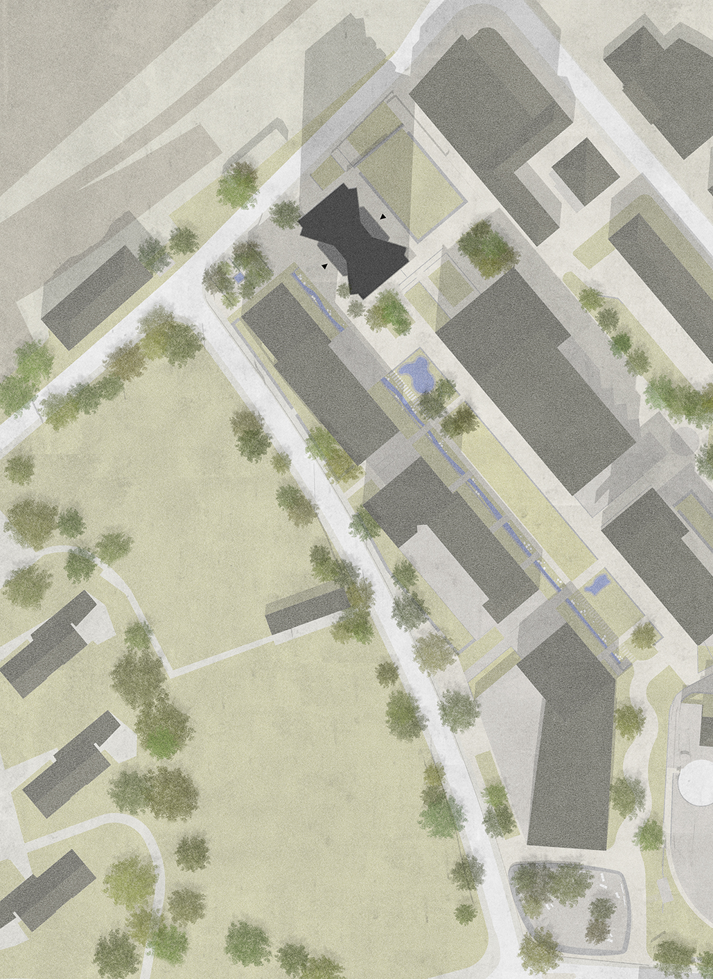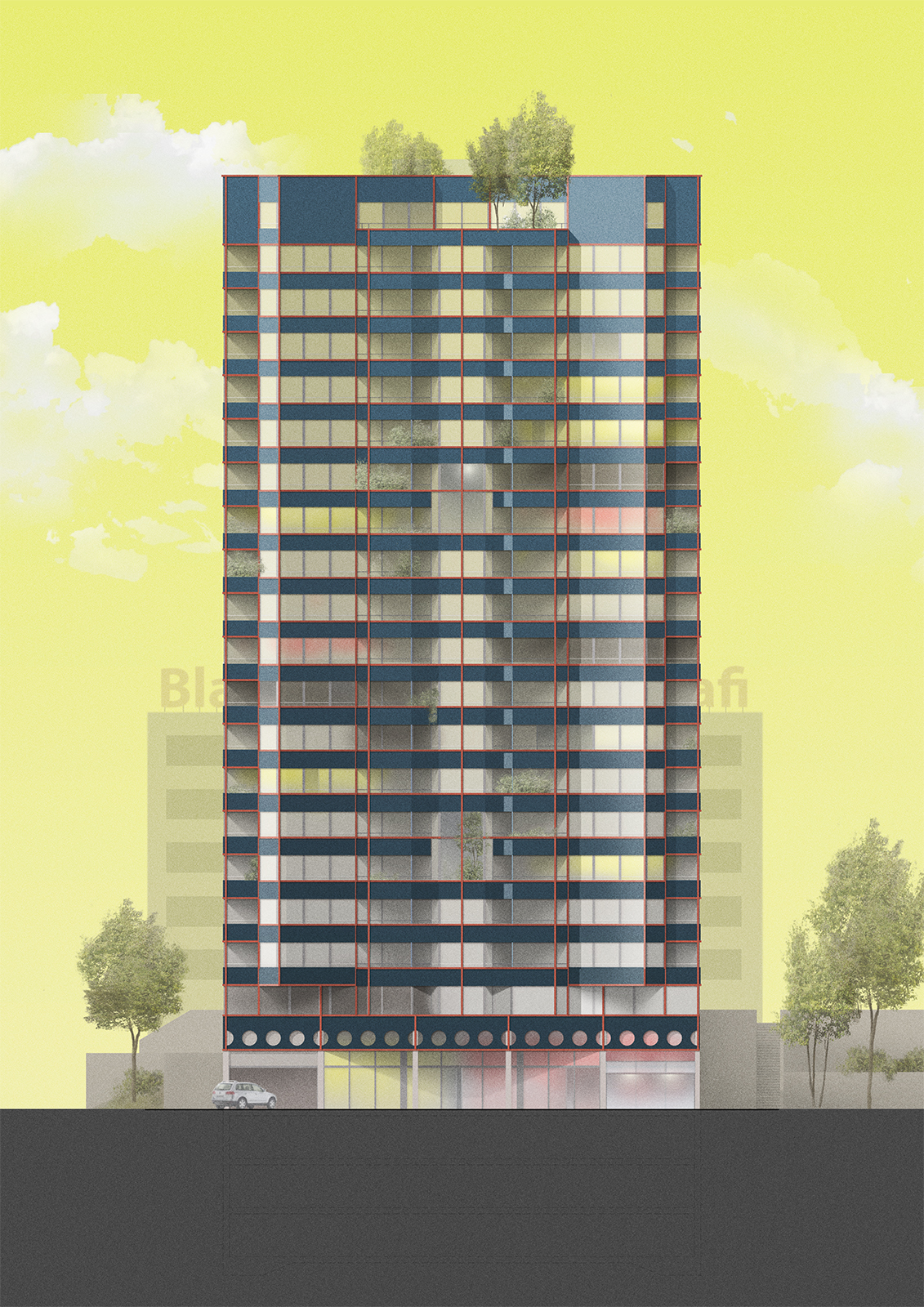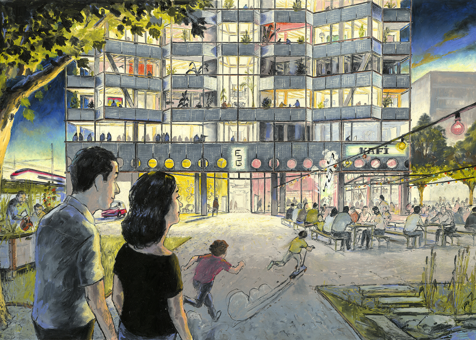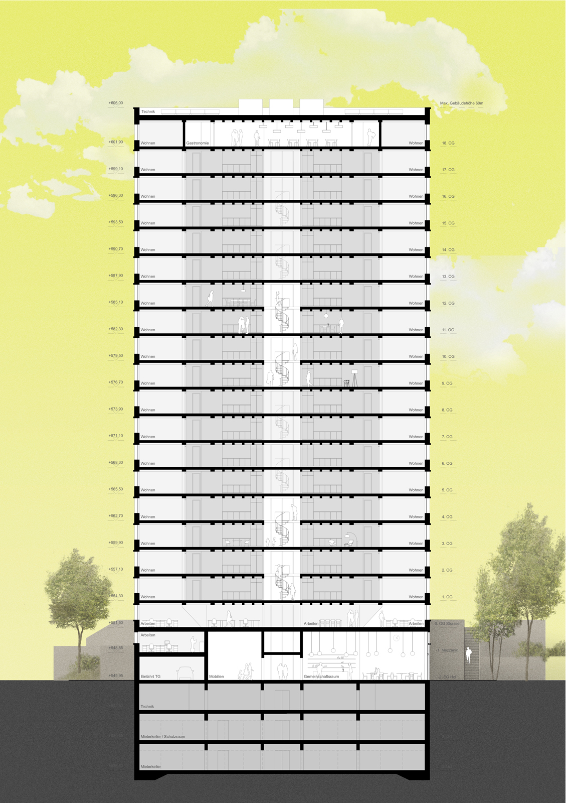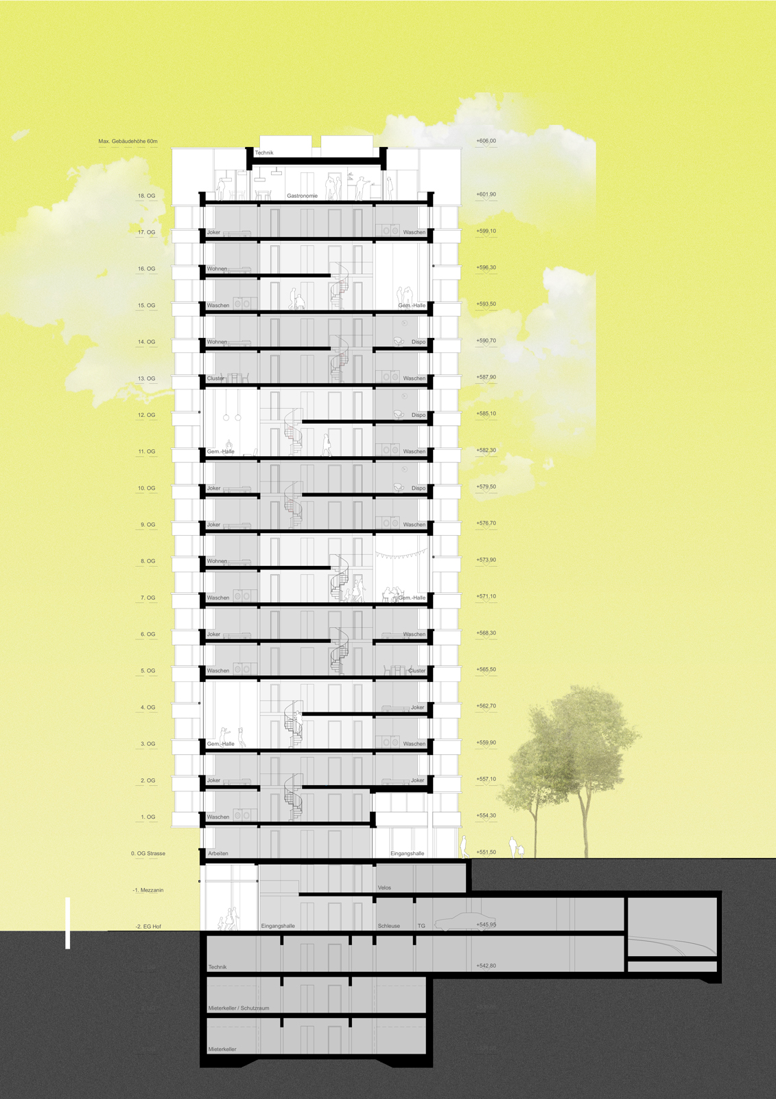 Die wichtigsten Orte im Hochhaus - ganz unten, an der Schwelle zur Stadt, und zuoberst, an der Schwelle zum Himmel – sind den wichtigsten Räumen für das Zusammenleben gewidmet. Gleich neben dem kleinen Café liegt der grosszügige, überhohe Kulturraum, der sich dank seiner nach oben schwenkenden Garagentore direkt mit dem Hofraum verbinden lässt. So erhält das grosse Gebäude die öffentliche Widmung, die einem Gebäude dieser Höhe entspricht. Zuoberst im Haus liegt das Restaurant mit Blick in alle Himmelsrichtungen und zwei weitläufigen Terrassen.