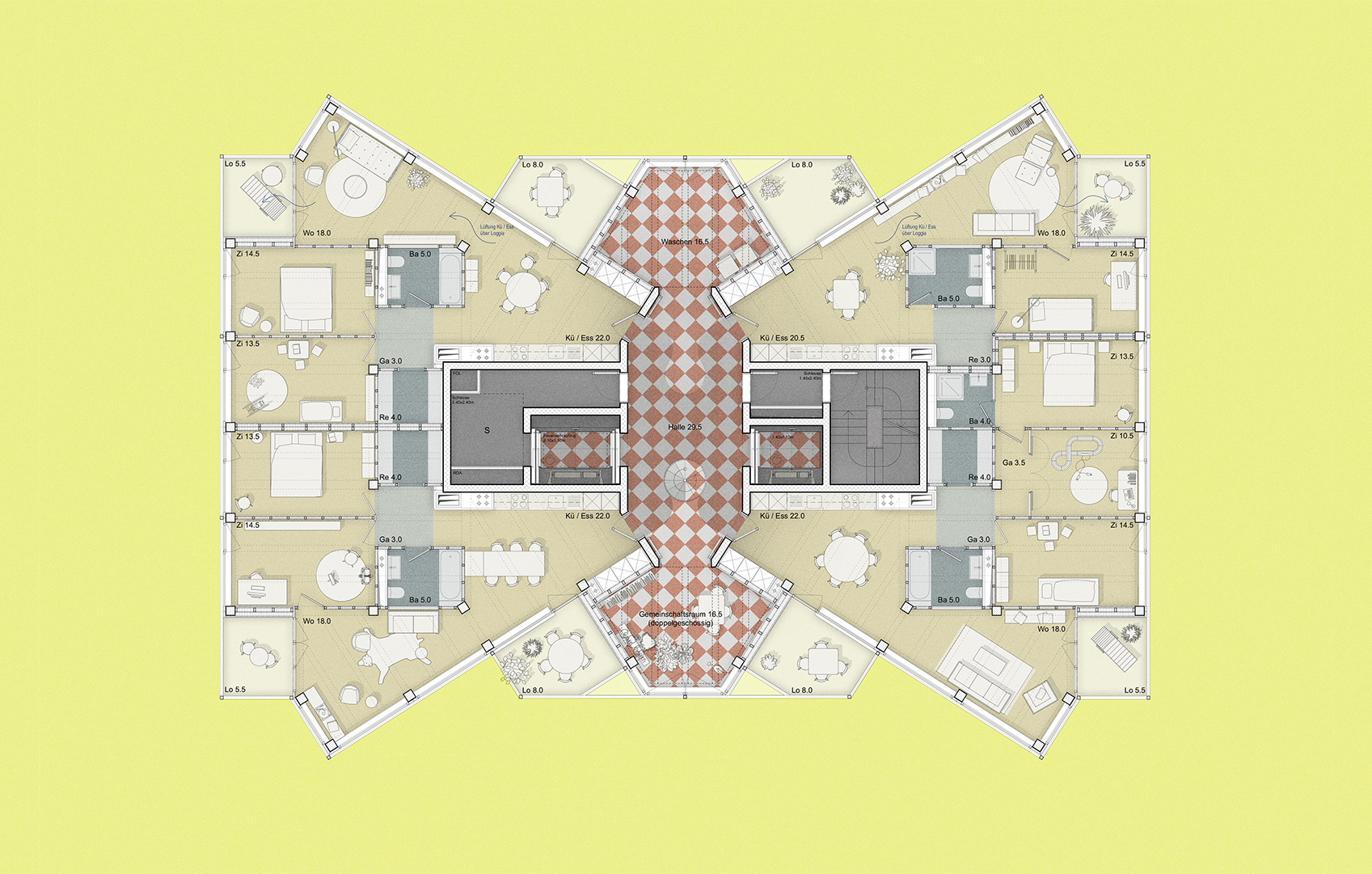 Dank der sechseckigen Räume, welche den Erschliessungshallen auf beiden Seiten vorgelagert sind, kann das Holliger-Hochhaus eine Vielzahl von Szenarien unterschiedlichster Aneignung aufnehmen. Darum ist die vorgeschlagene Zuordnung der Nutzungen hier bloss als Momentaufnahme zu verstehen: Als Waschsalons oder Yogazimmer erweitern die Räume das kollektive Raumangebot, als Jokerzimmer werden sie temporär privatisiert und als Schaltzimmer bleibend privat.