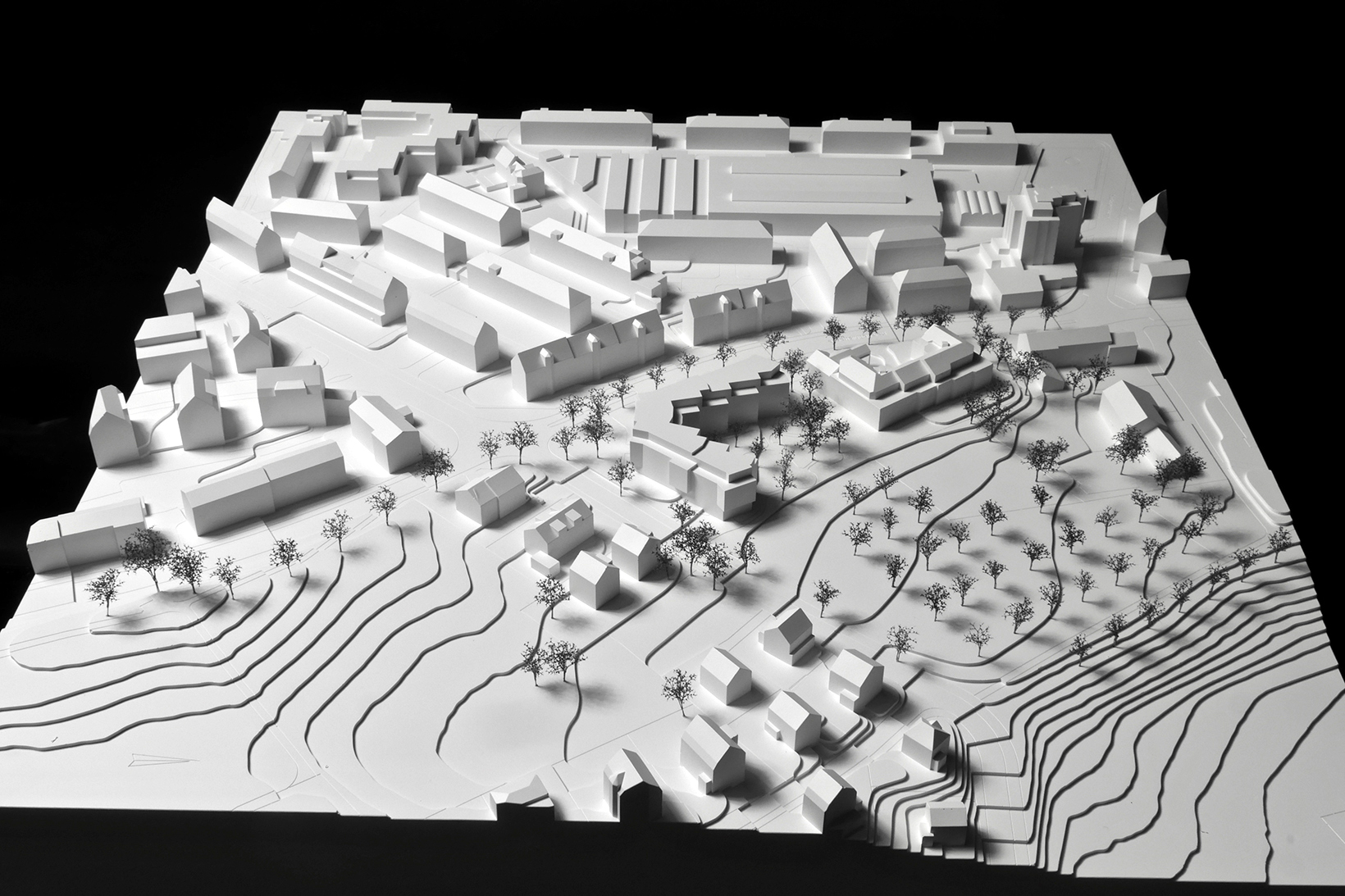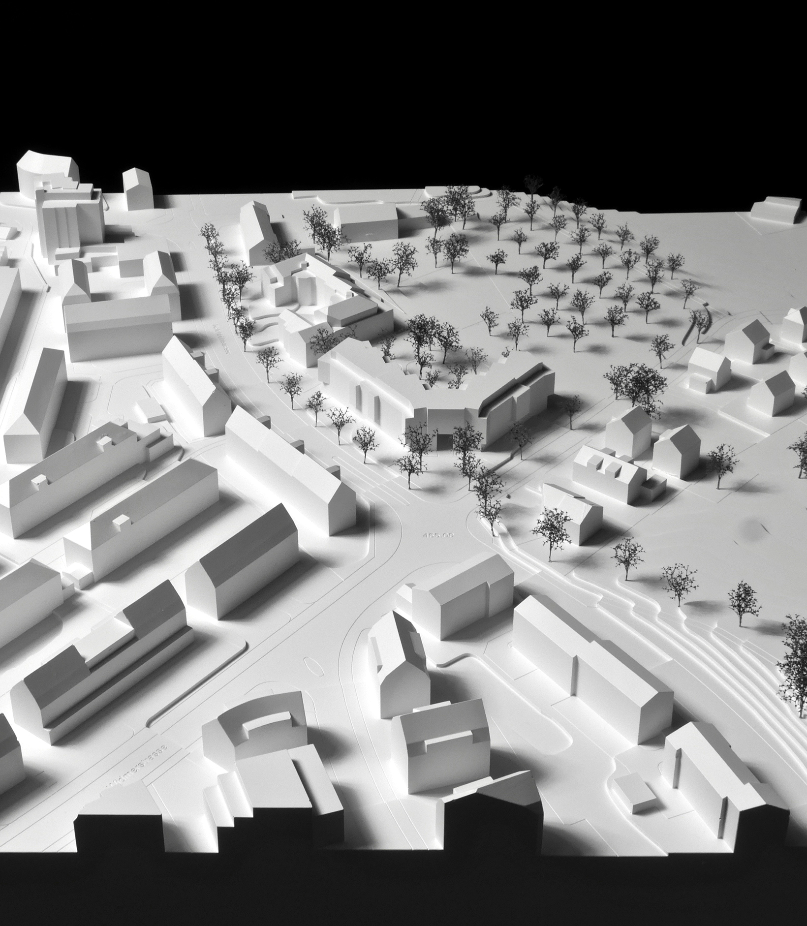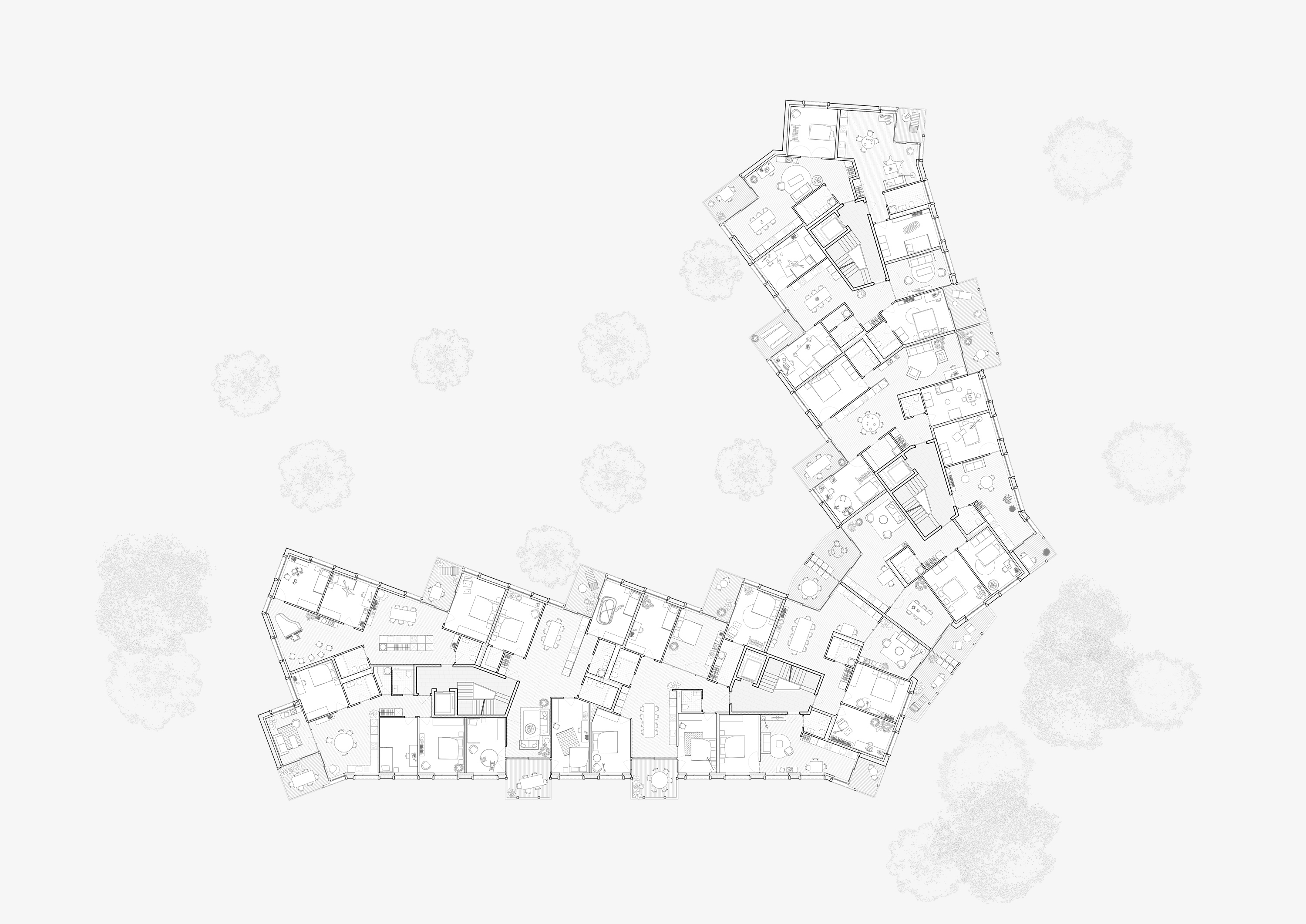 Was für eine atemberaubende Lage! Mitten in der Stadt und gleichzeitig auf dem freien Land! Der Blick reicht weit über das Becken des Zürichsees. Streuobstbäume bilden den Vordergrund, dahinter folgen die Wiesen des Schipferhofs und der Schulanlage Im Lee. Diese Sicht soll möglichst vielen Bewohnern offen stehen: nicht nur denen der angrenzenden Wohnungen, sondern auch denjenigen, die dahinter, in den Häusern der ‚zweiten Reihe’ wohnen. Da liegt es nahe, die grosse Baumasse winkelförmig aufzufächern, so dass ein grosser Hof in der Mitte frei bleibt. Auf der Strassenseite schafft die winkelförmige Disposition eine klare Fassung, wie sie gerade wegen des breiten, etwas unscharfen Strassenprofils wichtig ist.