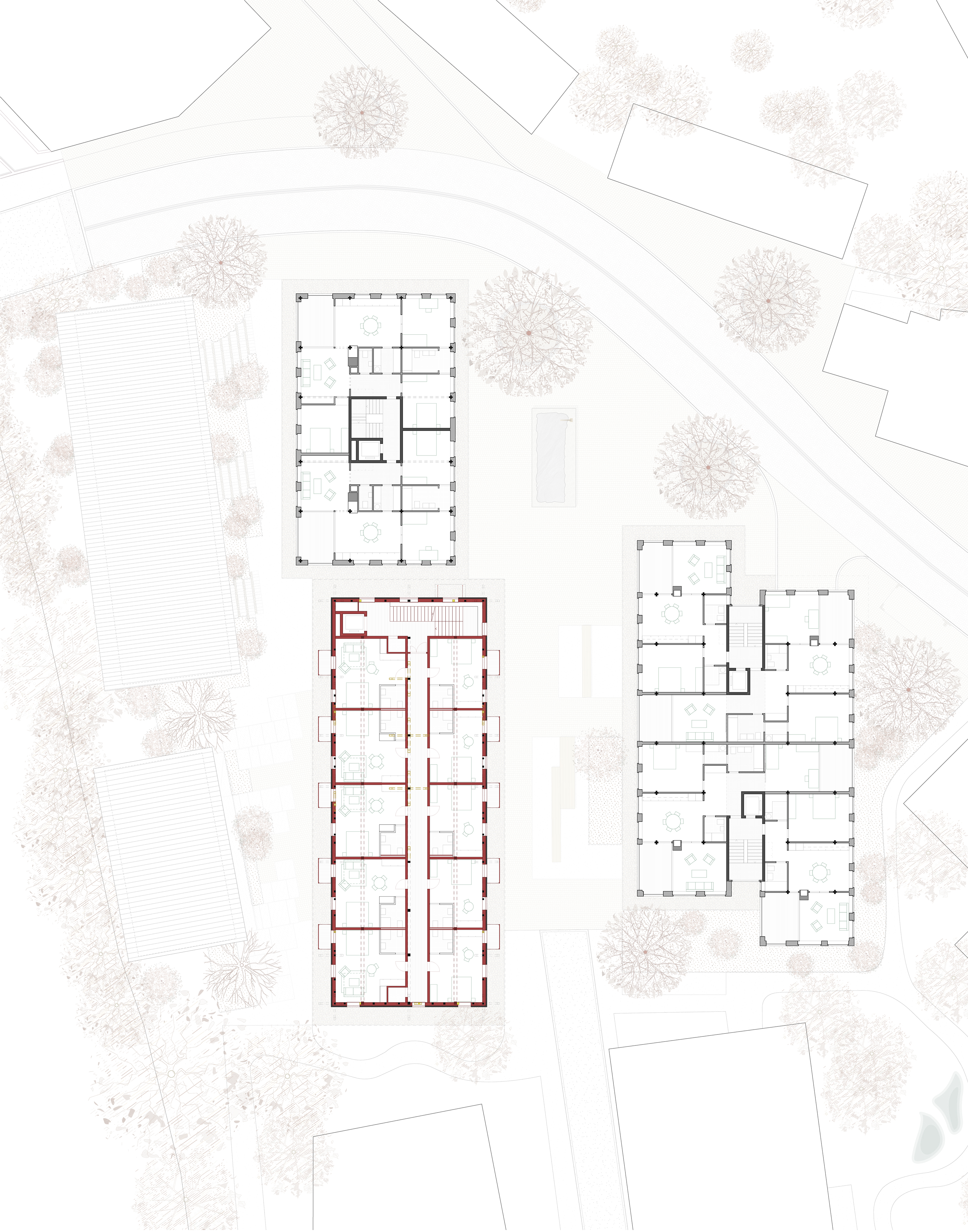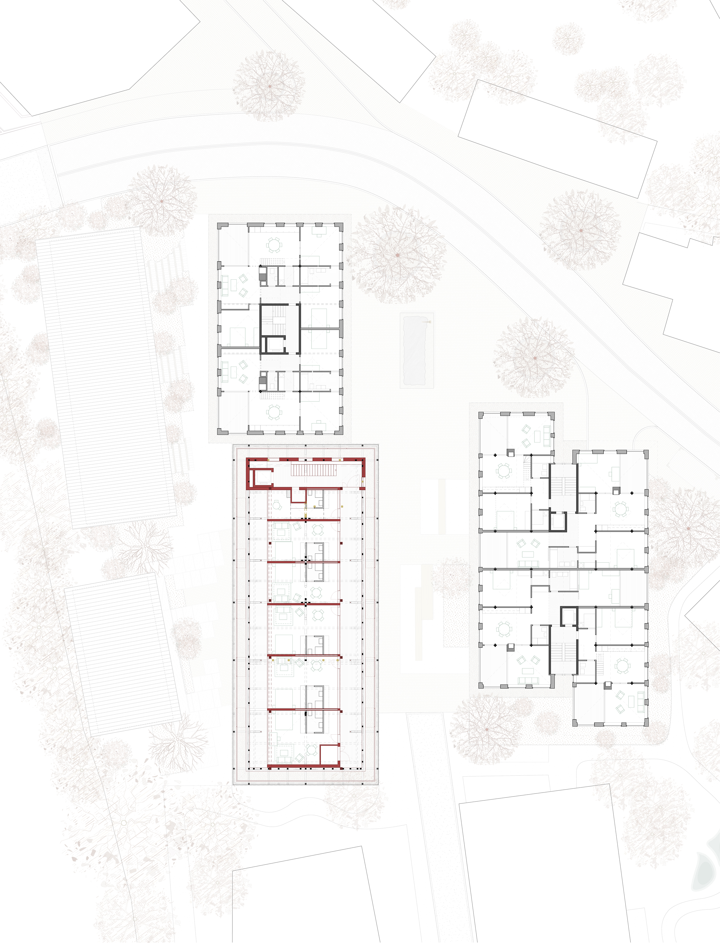 Kreuzstütze und Kammergrundriss: Uns fasziniert die strukturelle Regelhaftigkeit, wie wir sie in den regionalen Holzbauten ebenso wie in den frühindustriellen Industriebauten vorfinden. Ungerichtete Stützenraster lassen Spielraum für verschiedenartige Nutzungen, ein repetitiver Fensterrhythmus ordnet die Fassaden. In den Wohnhäusern gliedern kräftige Kreuzstützen die Wohnungen in ein Gefüge gleichwertiger, zellenartiger, verbundener Räume – ganz im Sinne traditioneller Kammergrundrisse, wie sie für Holzbauten typisch sind. Es versteht sich von selbst, dass die Spannweiten auf die Leistungsfähigkeit des Holzes abgestimmt sind.