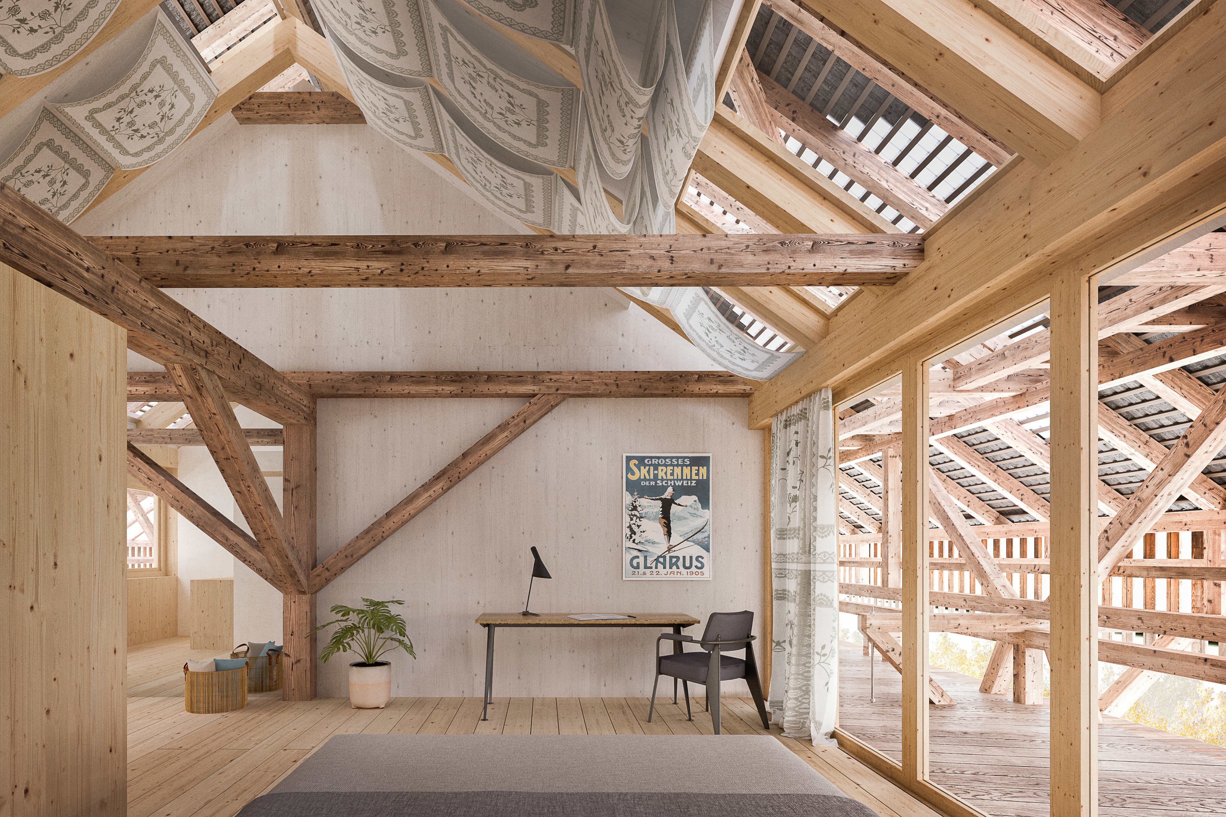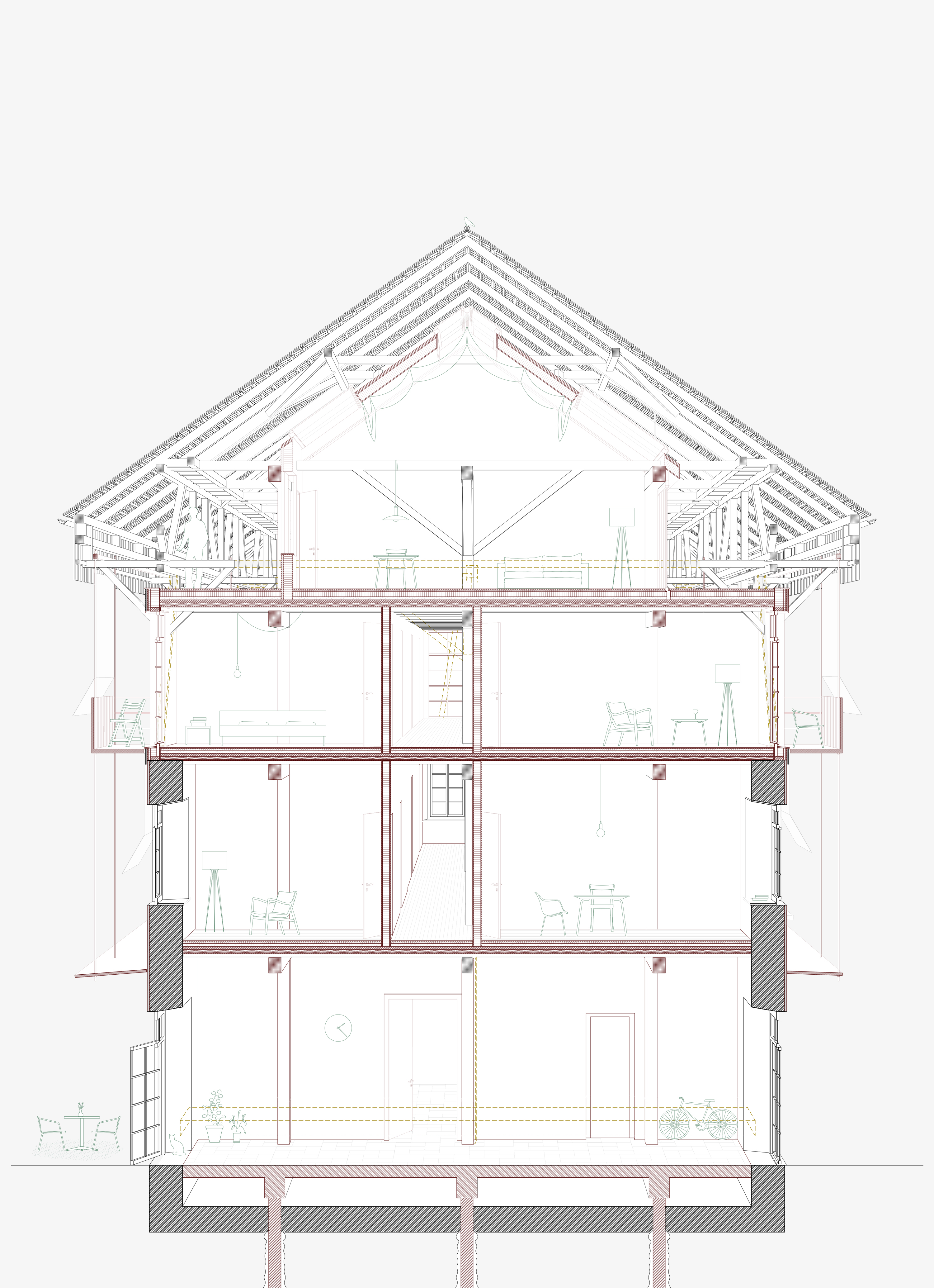 Der Hänggiturm - Neu und Alt im Verbund: Die weitläufigen Räume des Bestands mit der kleinräumigen Guest-House-Nutzung bespielen? Dieser Ansatz mag auf den ersten Blick erstaunen. Die Kleinteiligkeit der neuen Nutzung hat jedoch den grossen Vorteil, eine komplementäre Tragstruktur integrieren zu können, welche die heutigen Herausforderungen bewältigt (Brandschutz, Aussteifung, Lastabtragung). So wird die in die Jahre gekommene, zerbrechliche Struktur mit neuem Stabwerk gleichsam zusammengeknotet und unterstützt. Dabei werden die bestehenden Bauteile stabilisiert und ertüchtigt. Sie werden also nicht einfach obsoletes Beiwerk, sondern tragen gemeinsam mit den ergänzenden statischen Elementen! Der Dachstuhl bleibt auf diese Weise kalt und gut durchlüftet, also unbelastet von thermischen Eingriffen, und wir erleben ihn auch in Zukunft in demselben magischen Zwielicht wie heute.