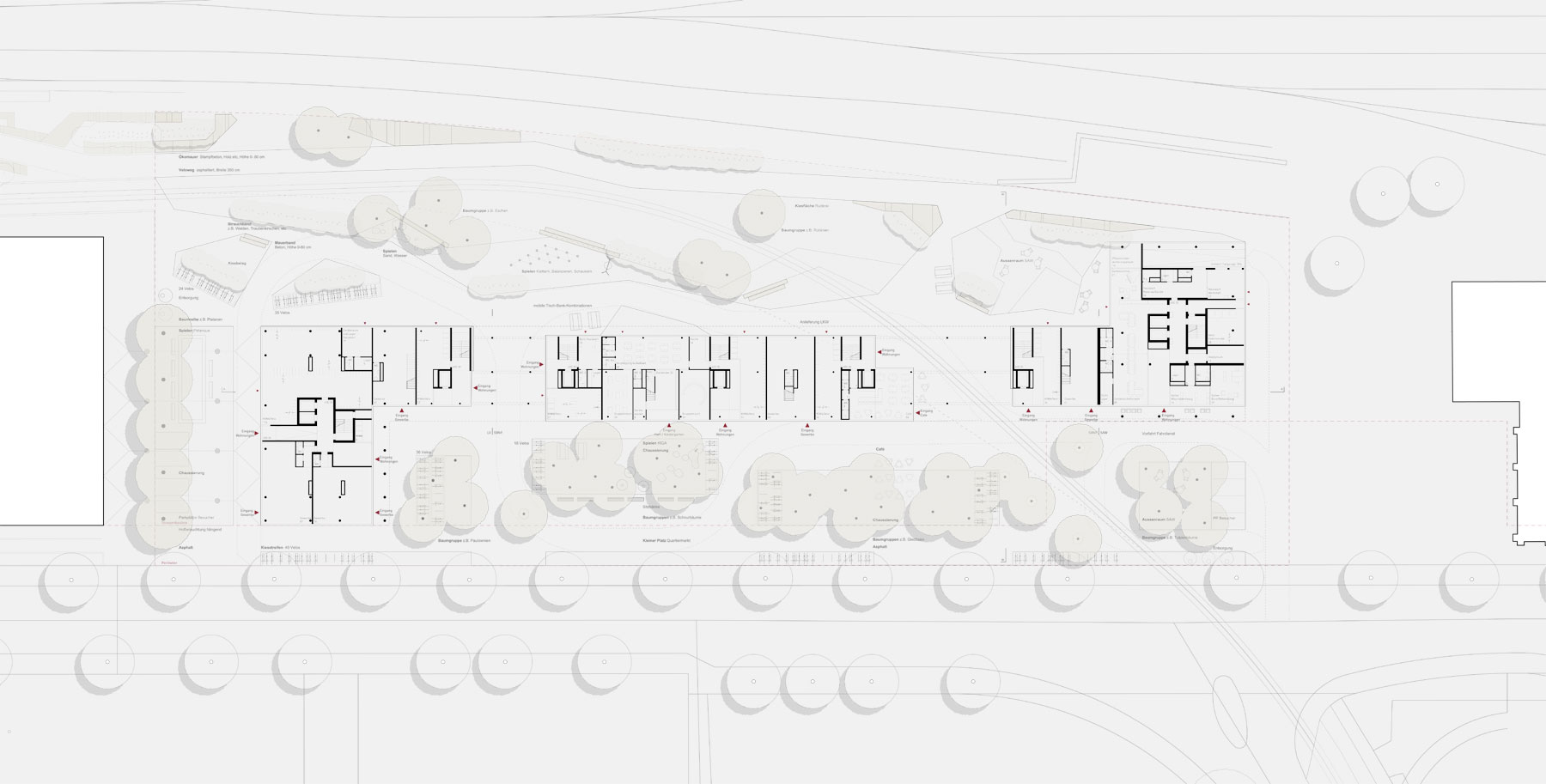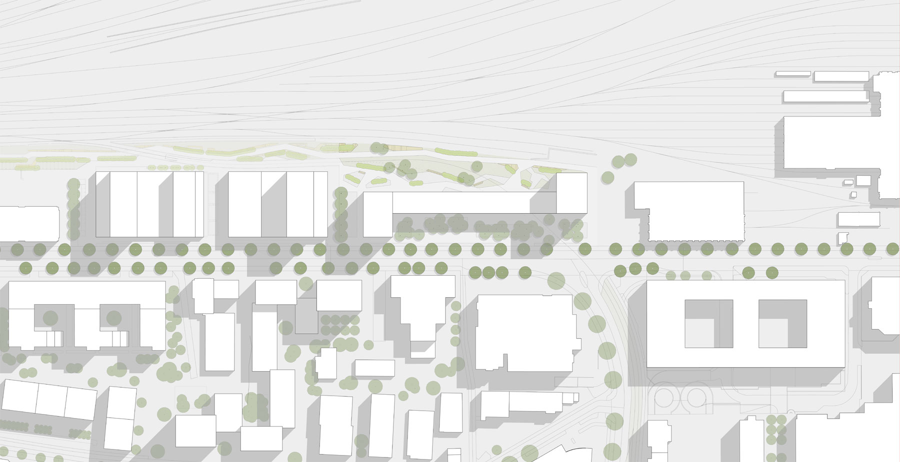 Konzeptuell nicht minder wichtig ist der zweite Aussenraum auf dem Areal: der Parksaum am ‚Gleisufer‘ wird aus dem Areal Letzibach C weiter geführt und das landschaftsarchitektonische Thema der ‚verflochtenen Ströme’ weiter ausgebreitet, wie es im Teilareal C bereits angelegt ist.