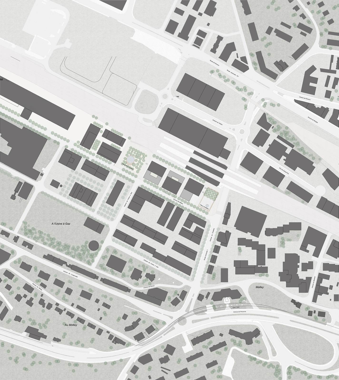 In Prilly-Malley geht es um viel, denn hier liegt der meistfrequentierte Bahnhof des ‚Ouest Lausannois’, jenes Verbundes von acht Gemeinden, die ihre künftige Entwicklung gemeinsam koordinieren wollen. Diese Bündelung der Kräfte ist aufwändig, denn sie betrifft nicht nur verschiedene Gemeindegebiete, sondern zu immerhin 80% privates Grundeigentum. Erst vor diesem Hintergrund wird deutlich, was bereits erreicht ist: Der neue Stadtteil, der hier entsteht, ist von den öffentlichen Räumen her konzipiert worden, nicht von den privaten Territorien. Plätze, breite Strassen und Parks sind für die Allgemeinheit bereits gesichert, gut ausgestattet und detailliert geplant. Sie sind entscheidend für die Aneignung, die Belebung und damit für die Bildung von Identität in diesem neuen Stück Stadt.