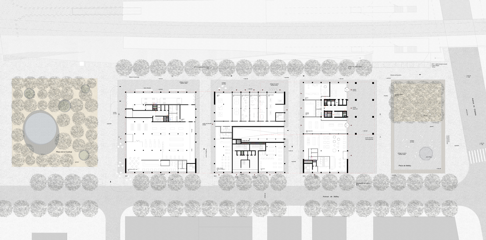 Es ist wichtig, die Planung der Häuser auf den Baufeldern in diesem grösseren Kontext zu diskutieren. Andernfalls werden die Baufelder zu insularen Binnenwelten, die sich selbst genügen, aber keinen Beitrag zur Belebung des öffentlichen Raums leisten. Darum wird im hier vorgestellten Projekt vorgeschlagen, alle Fussgängerströme an den Arealrändern zu konzentrieren, also entlang der Avenue de Malley oder dem Chemin des Bouchers.