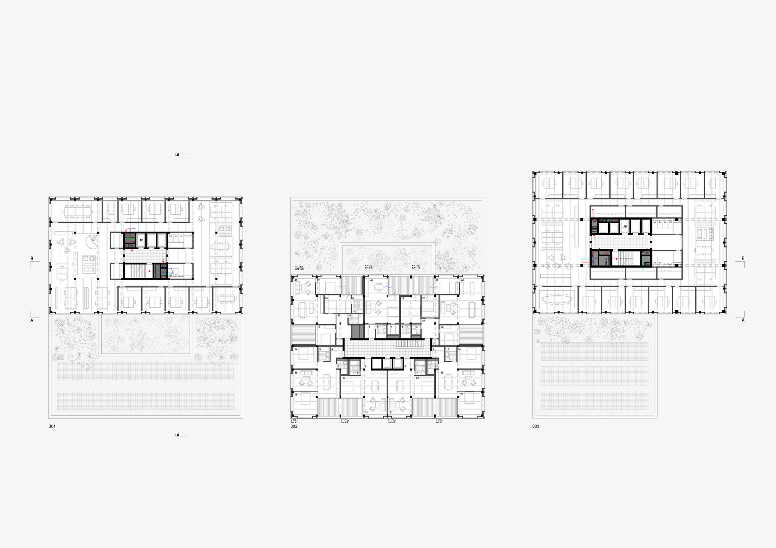 Grosse und kleine Baukörper stehen unabhängig voneinander (wie im Programm gewünscht), aber in freundschaftlicher Nähe zueinander. Sie bilden eine Gruppe, ein ‚Agglomerat’, ohne dass sie miteinander verschmelzen (‚Konglomerat’).
