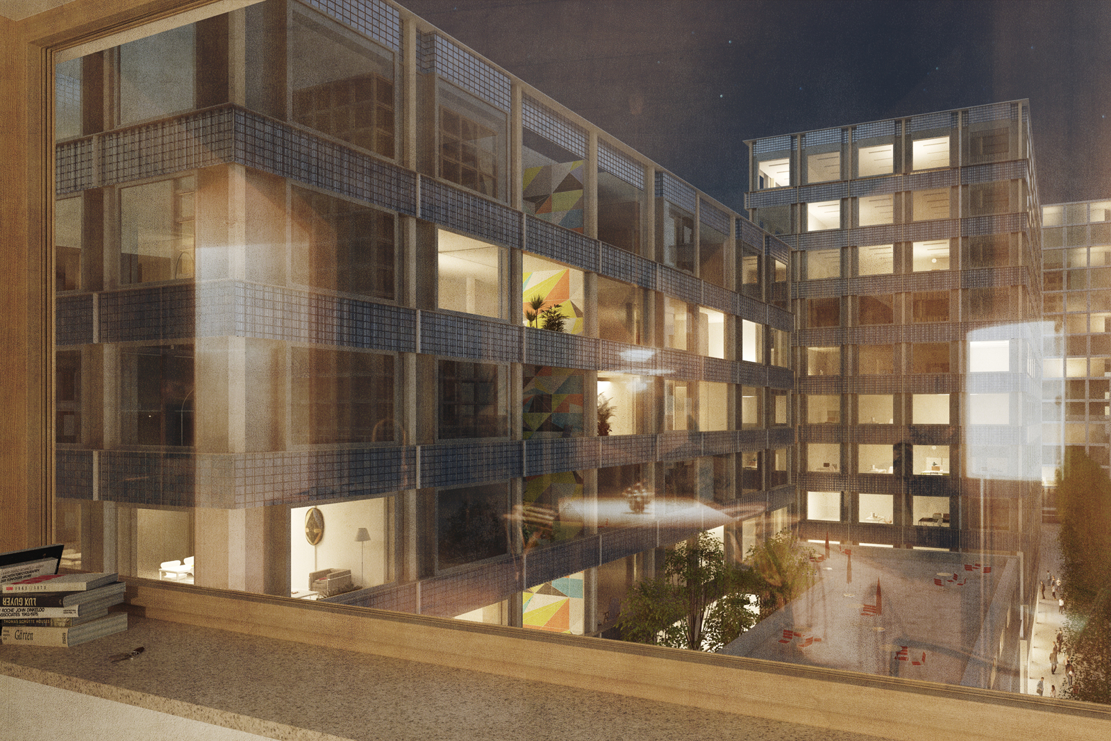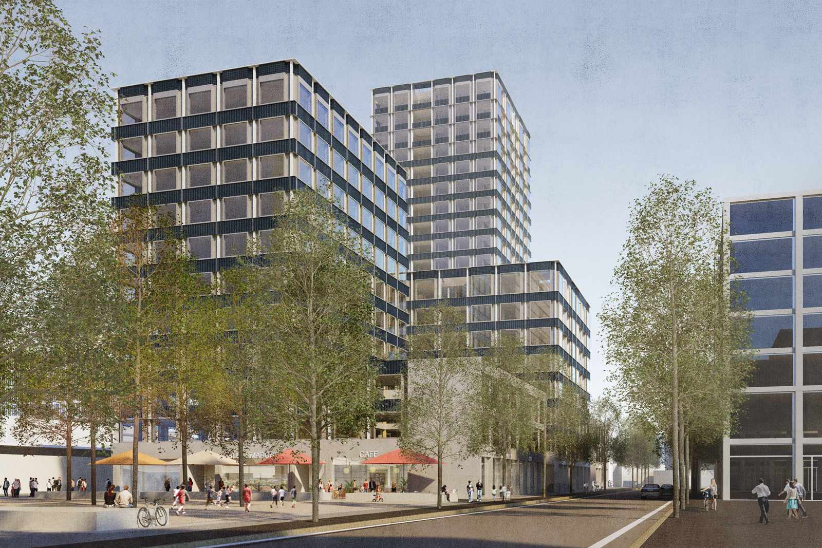 Die Baukörper sind einfache, unaufgeregte, gut proportionierte Quader. Bewusst wird auf die Sprache von ‚signature buildings’ verzichtet. Denn weil nur schon die Dichte und Höhe der Gebäude aussergewöhnlich sind, entstehen dazwischen Räume von grosser Eindringlichkeit, die nicht durch lautes Design weiter aufgeladen werden sollten. Vielleicht könnte man die Ensemblewirkung des Rockefeller Center in New York als Referenz anführen: auch dort bezieht der Stadtraum seine Prägnanz gerade aus der Schmucklosigkeit, ja mechanischen Fassadensprache der Gebäude.