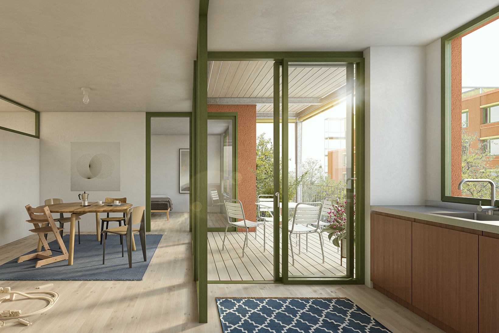 Wiederkehrendes Grundmotiv: Die Kombination von Küche, Essbereich und Loggia - Visualisierung: Maaars