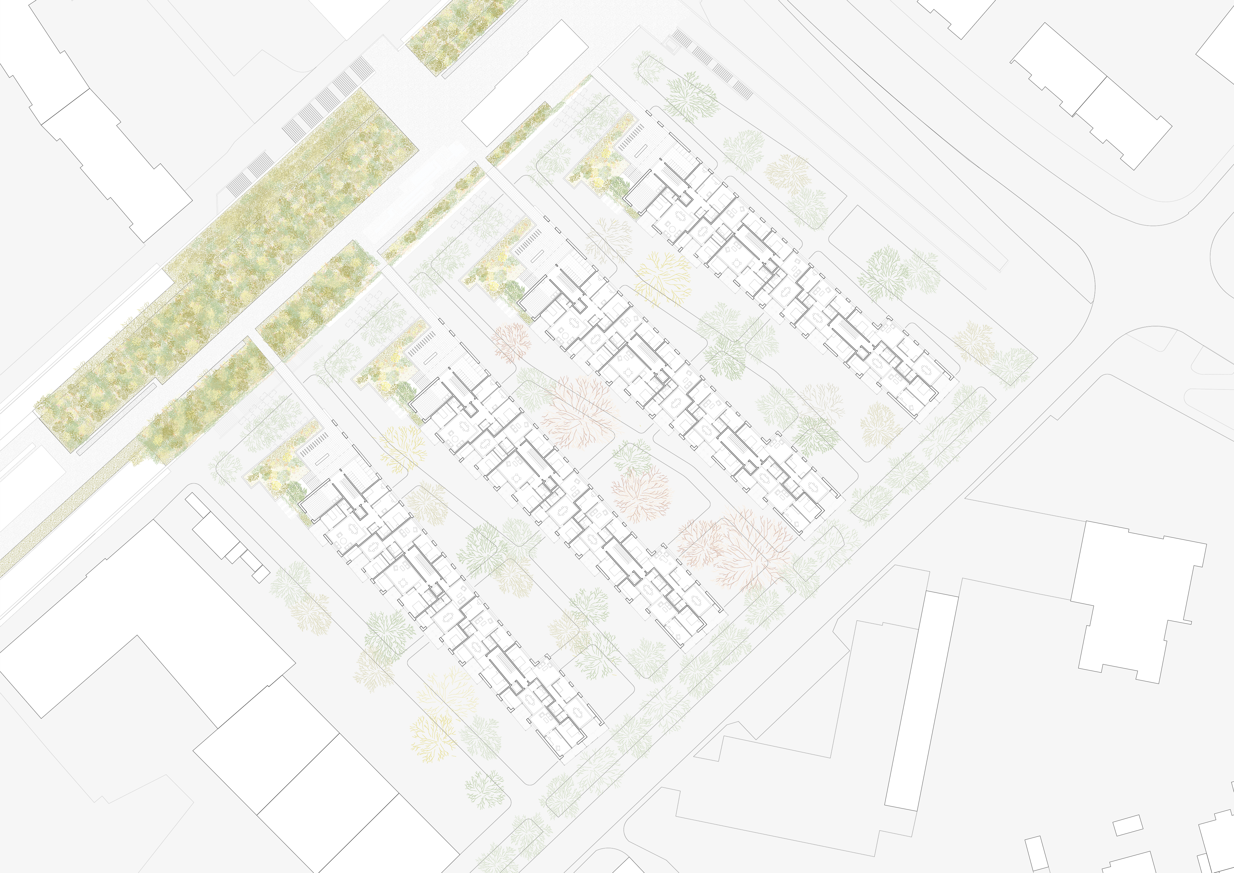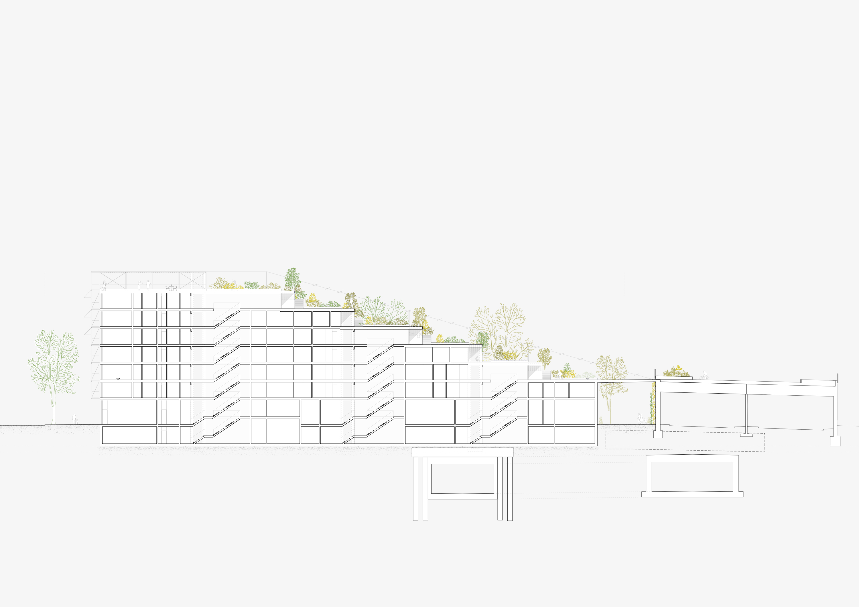 Die Stadt Zürich wird dichter und heisser, und nirgends wird dies deutlicher zu spüren sein als im "durchgrünten Stadtkörper" an den Rändern des Siedlungsgebiets, also dort, wo die grosse Verdichtung noch ansteht. Dass Verdichtung nicht „Dichtestress“, „weniger Luft zum Atmen“ oder „Zubetonierung der Lebensräume“ heissen muss, sondern eine Chance sein kann für eine grünere, kühlere, lebensfreundlichere Stadt, ist auf den ersten Bick widersprüchlich. Aber es ist möglich. Damit der Überlandpark das Versprechen einlösen kann, das er in sich trägt – ein verbindendes, kommunikatives, attraktives Element im Stadtraum zu sein – muss er die grösstmögliche Bedeutung erhalten: Er muss zur einmaligen Chance erklärt werden für die, die hier wohnen werden. Die neuen Häuser verneigen sich gleichsam vor dem Überlandpark. Sie neigen sich soweit hinab, dass sie auf gleicher Höhe sind und ähnlich breit, so dass der Brückenschlag so mühelos und einladend wird wie möglich. Anstatt die zweite Stadtebene des Überlandparks ins Innere der Häuser zu verlängern (wo ihre Belebung und Aneignung zweifelhaft ist), wird sie übergeführt auf die ansteigende Dachebene der Häuser. Oder sind die Häuser nichts anderes als Sockel (wie die Einhausung selber), die aber in luftige Höhe ansteigen? Die Gebäudeform, die sich vom breit lagernden Sockel zur hoch aufragenden Scheibe entwickelt, sorgt bereits für eine grosse Vielfalt an Wohnungs-„Charakteren“. Wo der Baukörper am tiefsten ist, sind die Wohnungen um weite Wohnhallen herum angelegt, in denen Wohn- und Essbereich vereinigt sind. In den Mittelbereichen sind Wohnen und Essen durch eine räumliche Taille aufeinander bezogen,und an den schmalen Gebäudeenden zur Überlandstrasse erreichen die Wohnungen eine spektaktuläre Längsausdehnung von 20m, die ihnen einen loftartigen Charakter gibt.