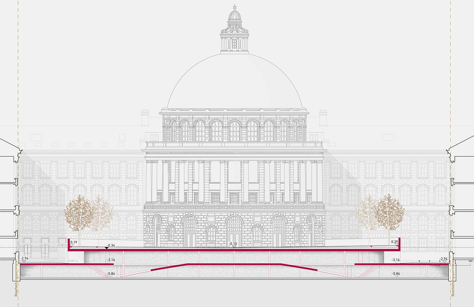 Je mehr dieser Platz als topografisches Element gelesen wird (und je weniger als Garagendach), desto selbstverständlicher wird seine Zugehörigkeit zum Stadtraum. Bäume betonen neu den ‚gewachsenen Grund’ des Platzes, laterale Treppen verbinden die Topografie des Platzes mit den Lichthöfen darunter.