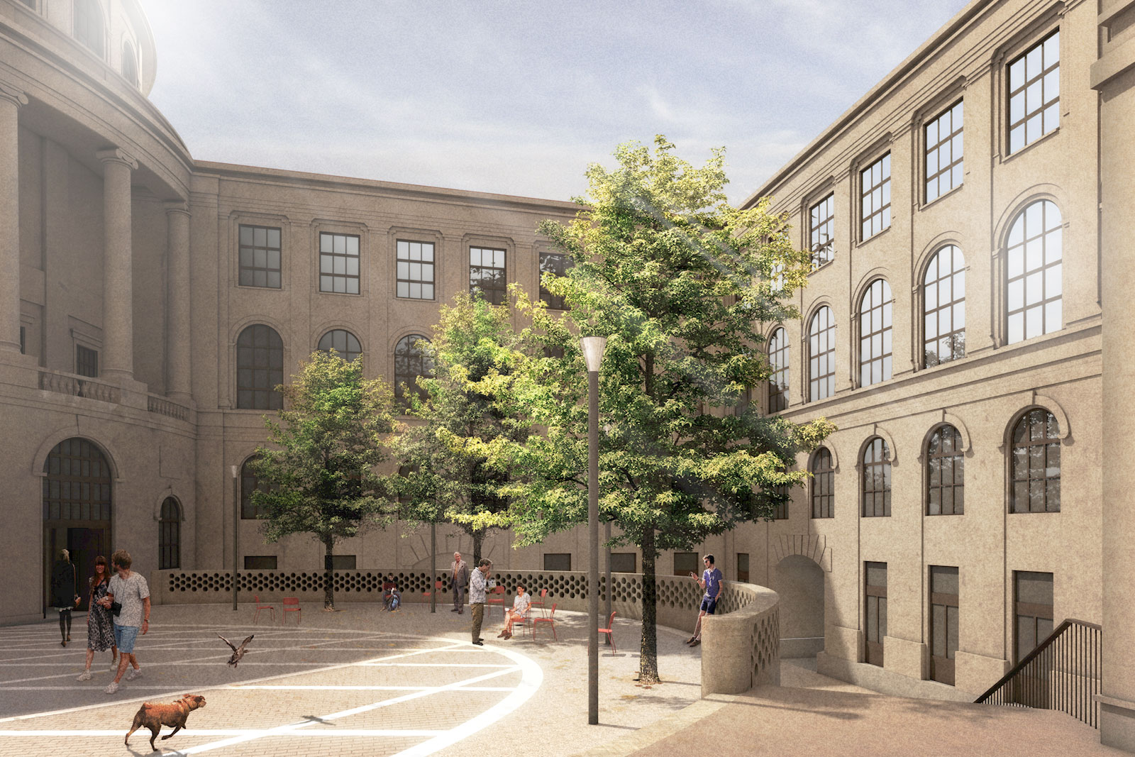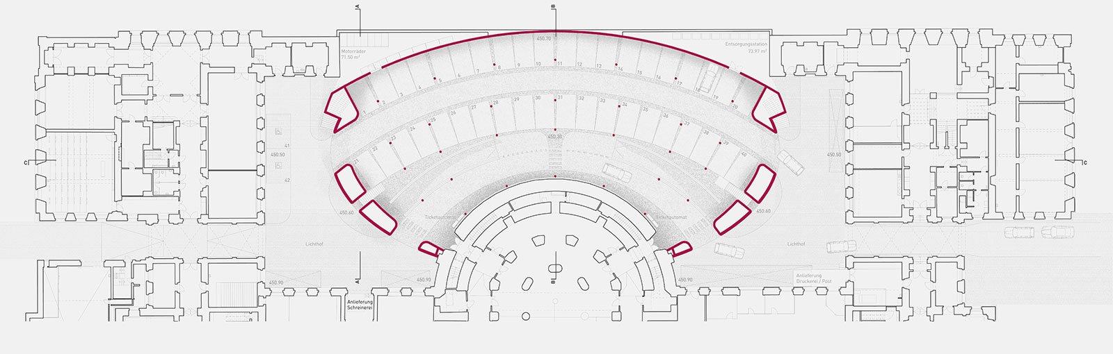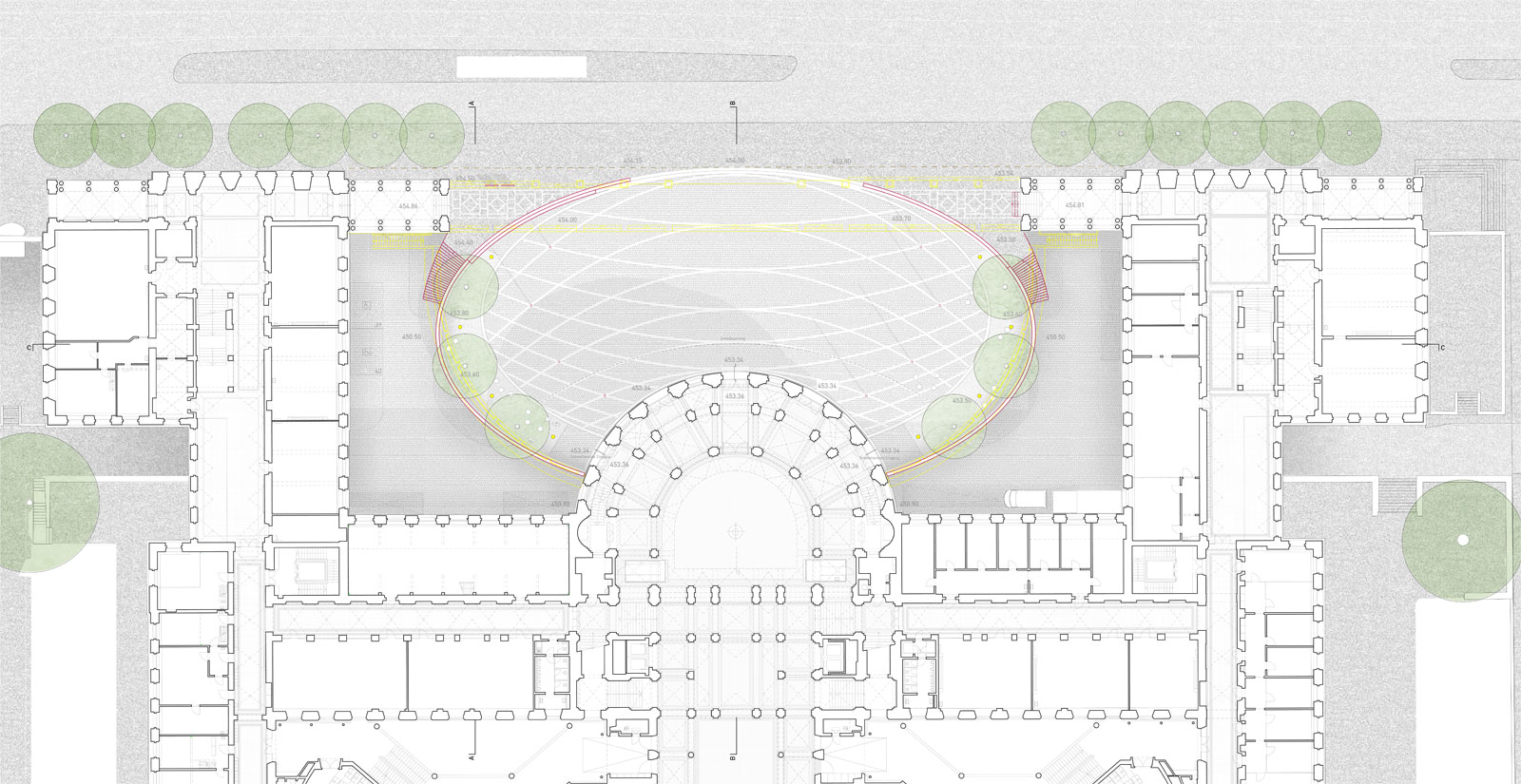 Um die Schule stärker in den Stadtraum zu involvieren und aus der ‚splendid isolation’ des Ehrenhofs zu lösen, muss die Stadt stärker in den Hofraum hineingreifen. Die ovale Platzkante verleiht im Zusammenwirken mit der Rotunde dem Hofraum eine beschwingte Bewegung und gemessene Festlichkeit. Es entsteht ein eigentlicher ‚Präsentierteller’ für die Aktivitäten der Schule.