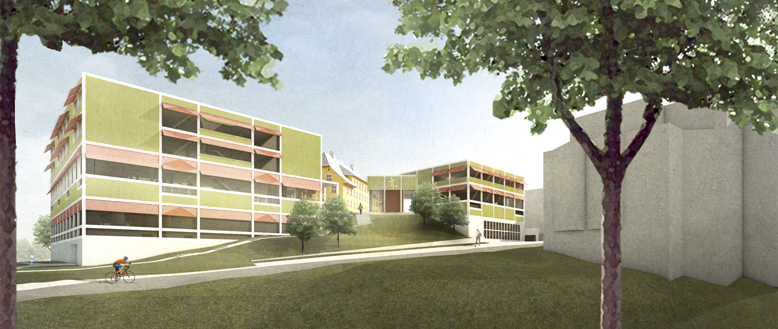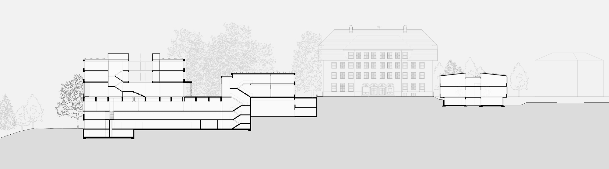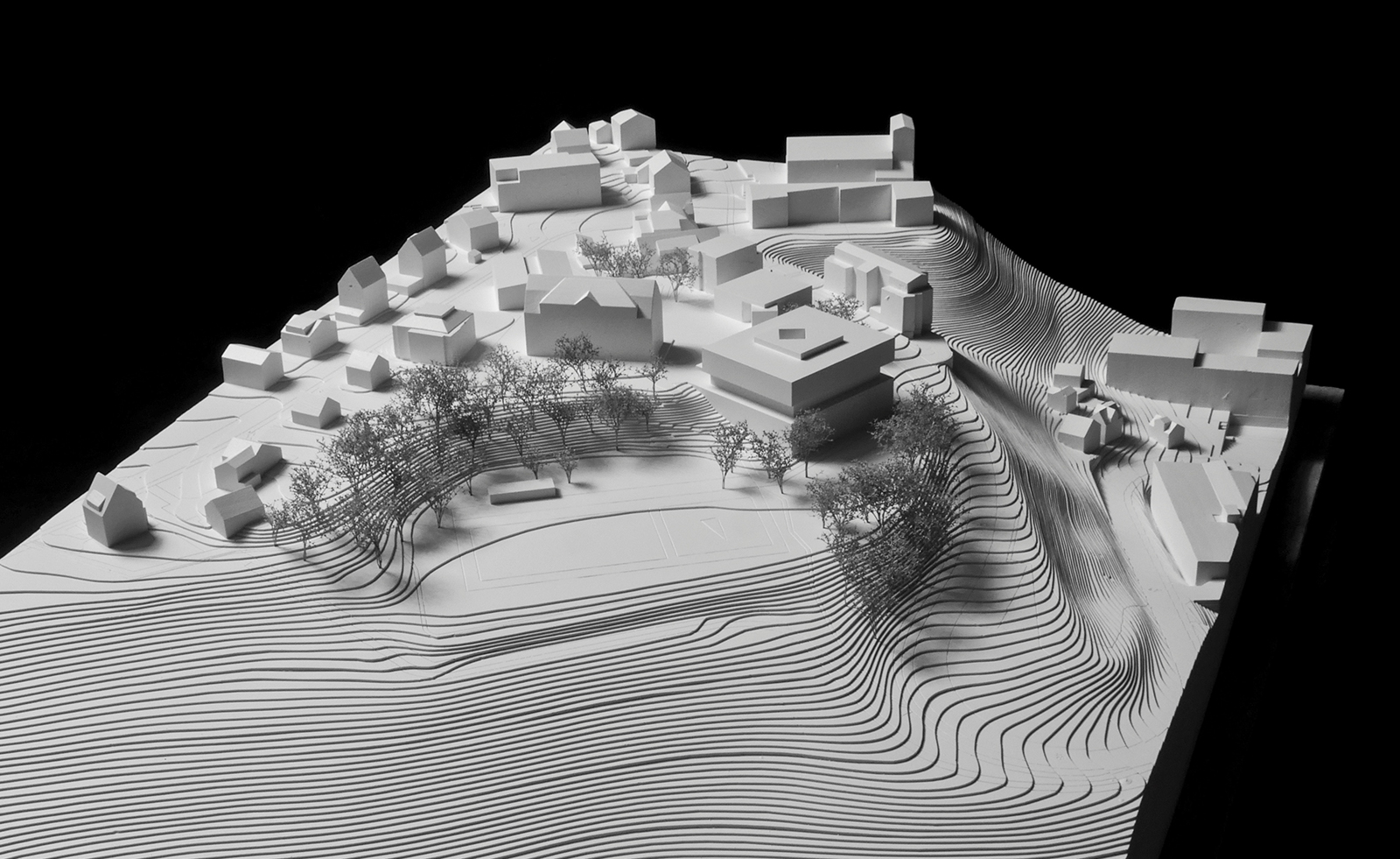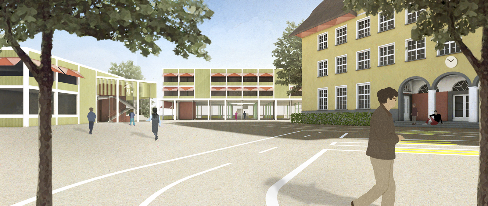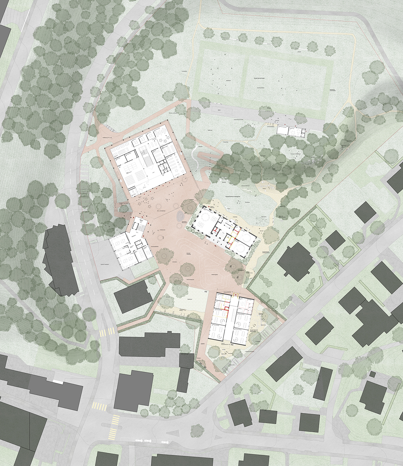 In erhabener Einzelstellung stand das Schulhaus vor hundert Jahren hoch über dem Tal der Emme. Heute, da die Siedlung das Schulhaus umschlossen hat, übernimmt der Neubau die Leuchtturmposition vom alten Gebäude: Selbstbewusst thront er auf der steilen Hangkante, ohne jedoch den Altbau in den Schatten zu stellen. Denn weil das neue Schulhaus kaum länger oder höher ist als das alte, bilden beide gemeinsam ein ausbalanciertes „Ensemble der Solitäre“. Zwei kleine Schulbauten begleiten die grossen wie Beiboote die Schiffe. Zwischen den Vieren wird eine ebenso zwanglose wie abwechslungsreiche Platzfolge aufgespannt.