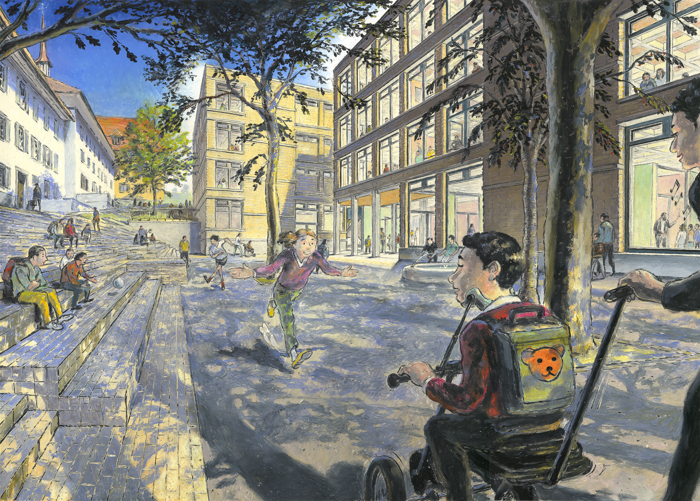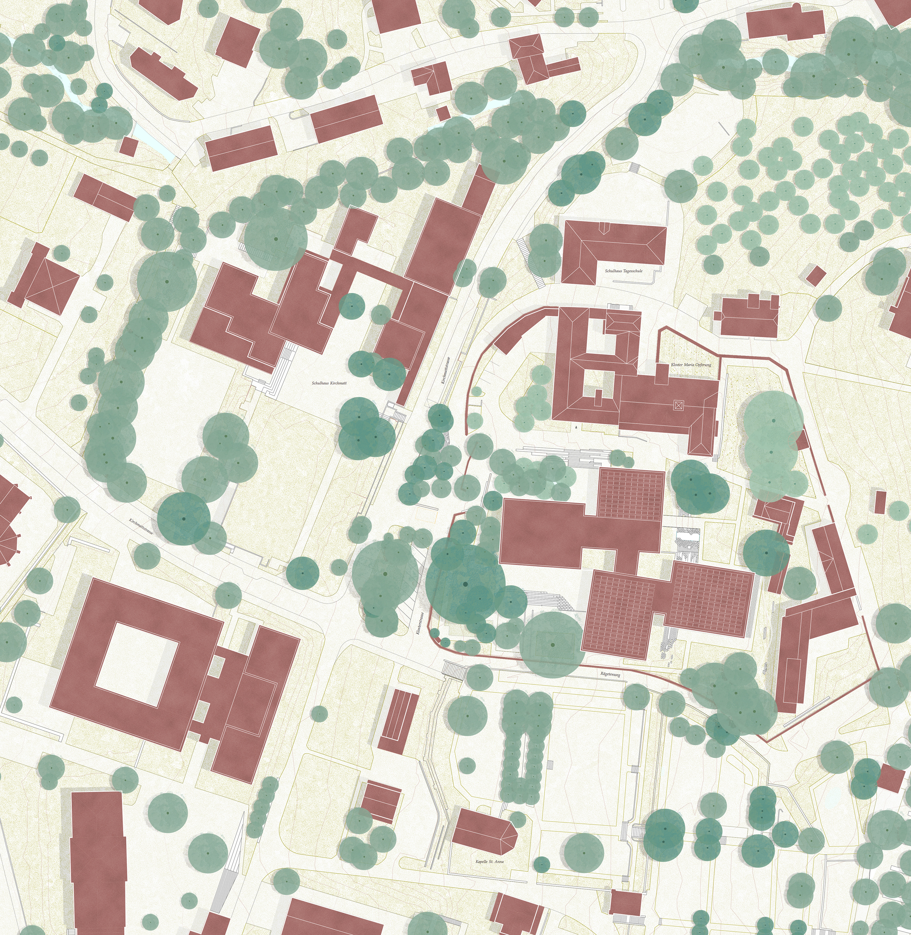 Barocke Klosteranlage, Bauerngut, historistisches Schulheim, neugotische Kirche, modernistische Schulanlagen: Die Sakral- und Bildungsbauten am Hang um St. Michael bilden ein eindrückliches Ensemble. Es ist ein Ensemble aus Solisten – eigenwillige und sperrige Persönlichkeiten, die Wert auf etwas Abstand legen. Und es ist ein labiles Ensemble, das davon lebt, dass sich kein Solist zu sehr über die anderen erhebt. Darum gilt für jede bauliche Intervention an diesem stark vorgeprägten Ort, dass sie sich in den Massstab der bestehenden Baukörper einordnet und den Nachbarn genügend Umraum lässt.