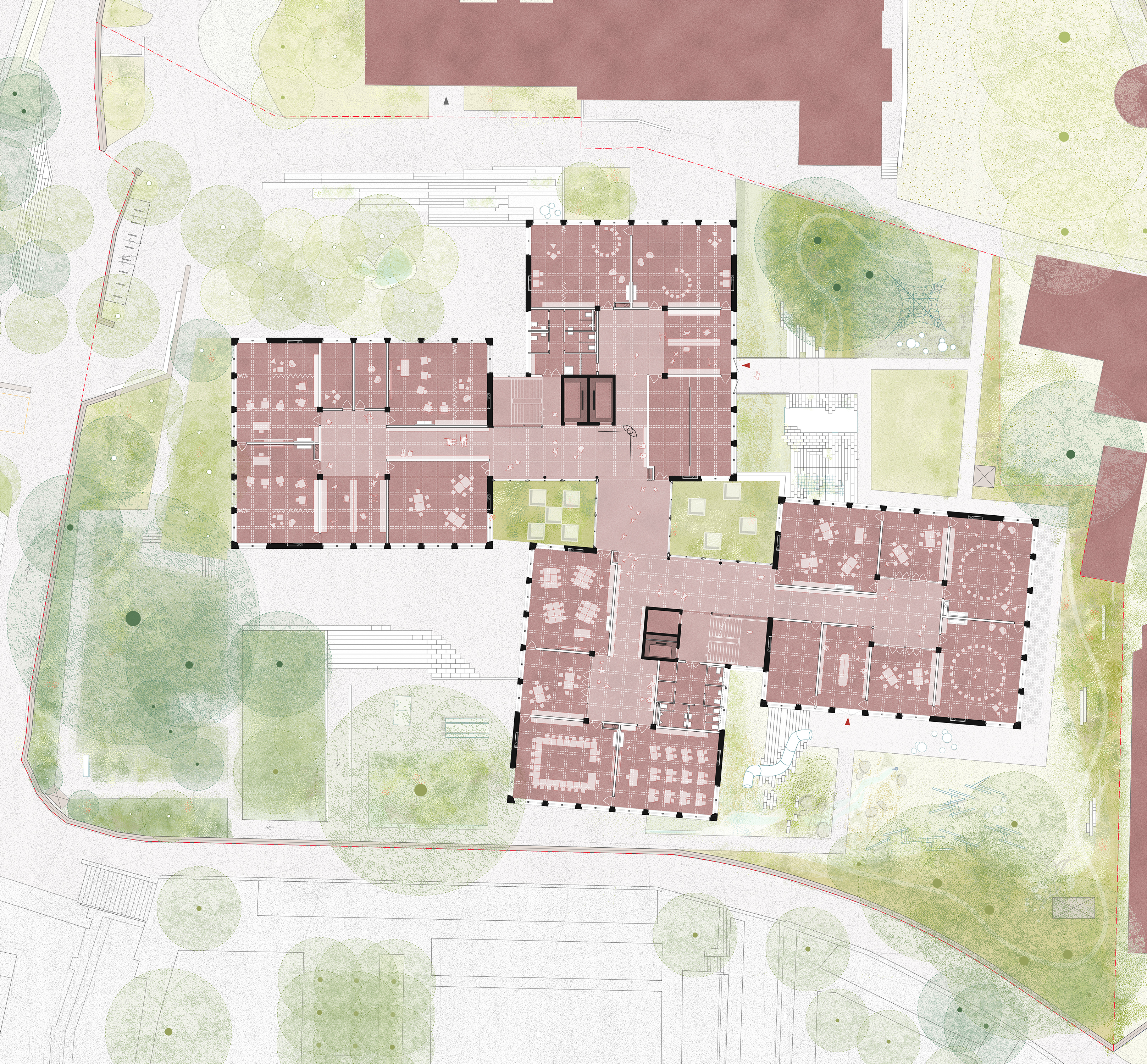 Um den Qualitäten dieses Ortes gerecht zu werden, wird der grosse Neubau aufgegliedert in vier kleinere Baukörper, die zwischen die bestehenden Baumgruppen eingepasst sind. Damit dies gelingt, besetzt der Neubau zu grossen Teilen den Fussabdruck des Baubestands. Anders als dieser breite, sperrige Bau wird das neue Gebäude aus der Perspektive des Fussgängers nur in Fragmenten wahrgenommen werden, die zwischen den mächtigen Baumgruppen hervortreten. Die kräftige Grossform in Kreuzgestalt ist nur aus der Vogelschau sichtbar – eine Wahrnehmung, die uns von Ferne an äthiopische Felsenkirchen erinnert, aus der Tiefe des Felsbodens herausgeschlagen.