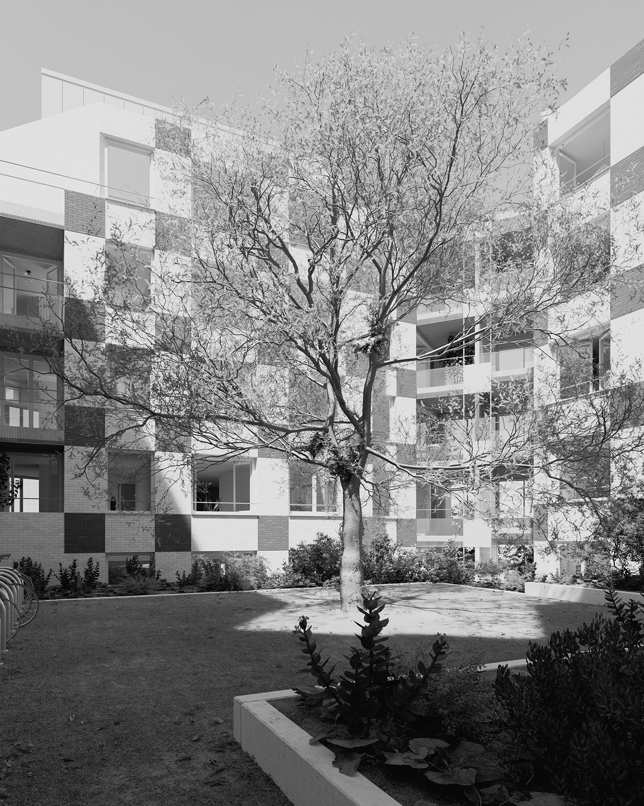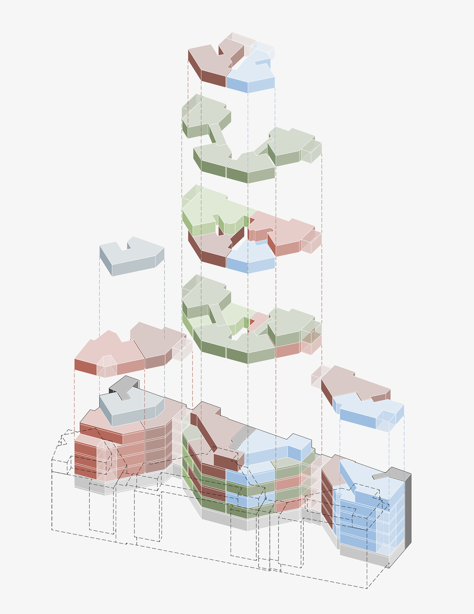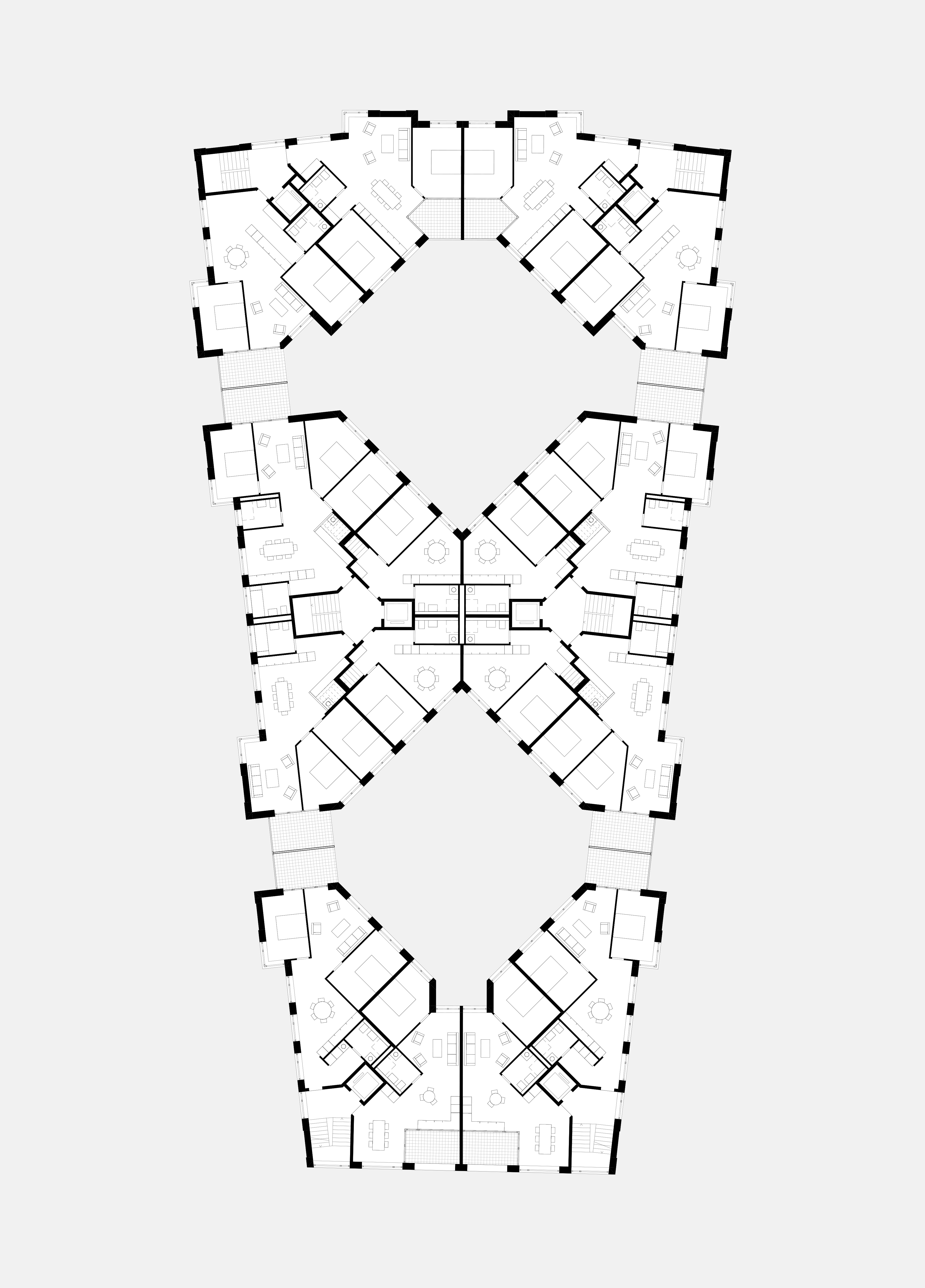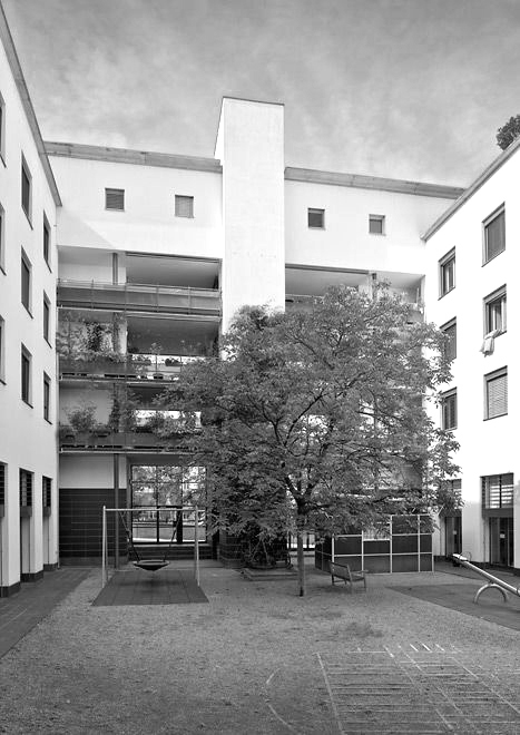 Jede Wohnung hat Teil an der geschäftigen Stadt- wie an der ruhigen Hofseite. Die Tagbereiche der Wohnung sind mehr der Stadt zugewendet, die Nachtbereiche mehr dem Hof. Dort, wo man die Wohnung betritt, sind Strasse und Hof am weitesten voneinander entfernt. Dort, wo man sie wieder verlässt und nach draussen tritt – auf der Loggia – kommen sich Strasse und Hof so nahe, dass sie einander berühren.