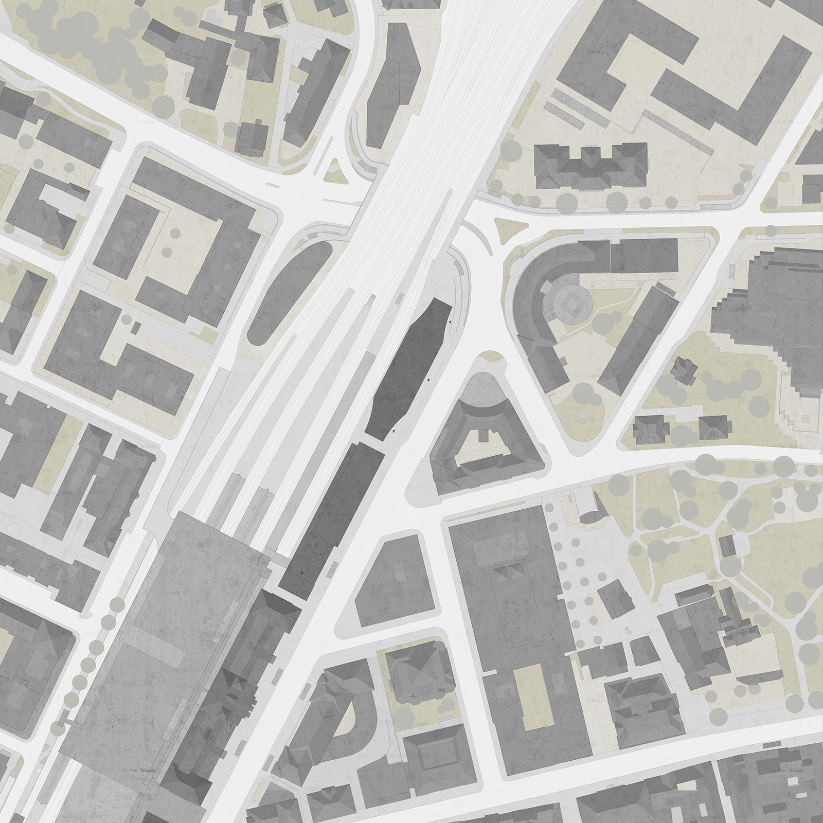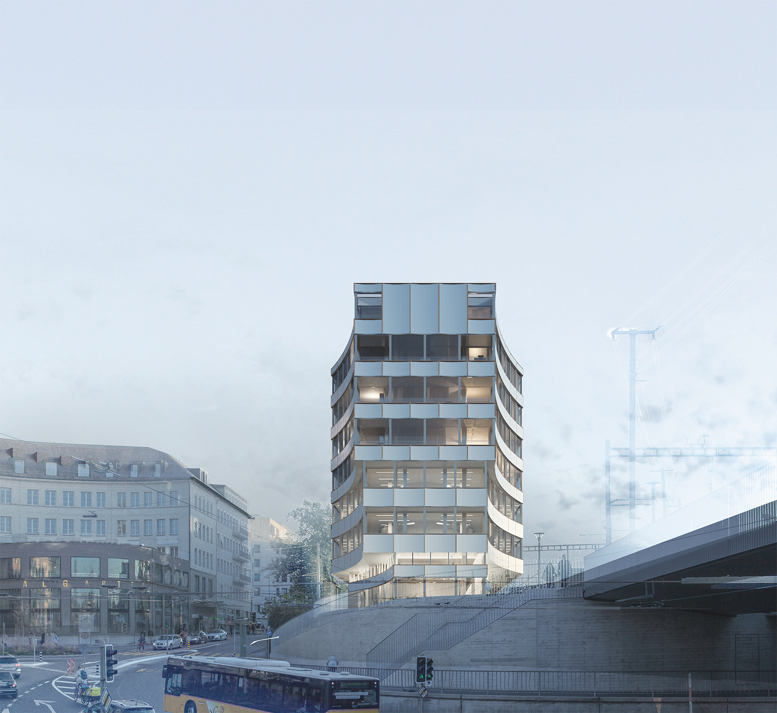 Am Bahnsteig des Winterthurer Bahnhofs stehen die Bauten wie die Waggons einer Zugkomposition: glänzende Wagen sind an staubige gekoppelt, hiesige an fremdländische, futuristische an altmodische. Die Gebäude auf dem schmalen Streifen an den Gleisen gehören eigentlich mehr zum Netz der Eisenbahn als zum Gewebe der Stadt. Insbesondere der neu angehängte Waggon wirkt so, als sei er mehr Mobilie als Immobilie. Das hat mit seiner Form zu tun: So wie Eisenbahn- oder Tramwagen an ihren Ecken abgefast sind, um in Kurven nicht auf die Gegenfahrbahn hinauszuragen, so sind auch am neuen Gebäude die Enden verjüngt. Die Verjüngungen dienen hier indes nicht dazu, das Gebäude ungehindert bewegen zu können, sondern um es im Gegenteil am Ort zu verankern und in Beziehung zu setzen. Denn ihre konkave Form wirkt komplementär zur konvexen Bewegung der Bauten gegenüber. Und vielleicht bildet sich darin auch die erodierende Kraft des Verkehrsstroms ab, der die Tief- und Hochbauten dieses Ortes so markant geformt hat. Direkt am Gleiskopf und hoch über der Strasse gelegen, verlangt die exponierte Lage nach einem ‚Anchor Building’. Darum ist die Regelhaftigkeit der Gebäudeform so wichtig: Diesem Baukörper sieht man nicht an, welche Kräfte der Umgebung ihn geformt haben könnten, sondern man traut ihm im Gegenteil zu, dass er seinerseits auf die Umgebung formend eingewirkt hat. Dank der beidseitigen Verjüngung erhält die Stirnfassade eine stehendere, elegantere Proportion. Ausserdem wird die formende, gleichsam erodierende Kraft der beidseits einwirkenden Verkehrsströme veranschaulicht.