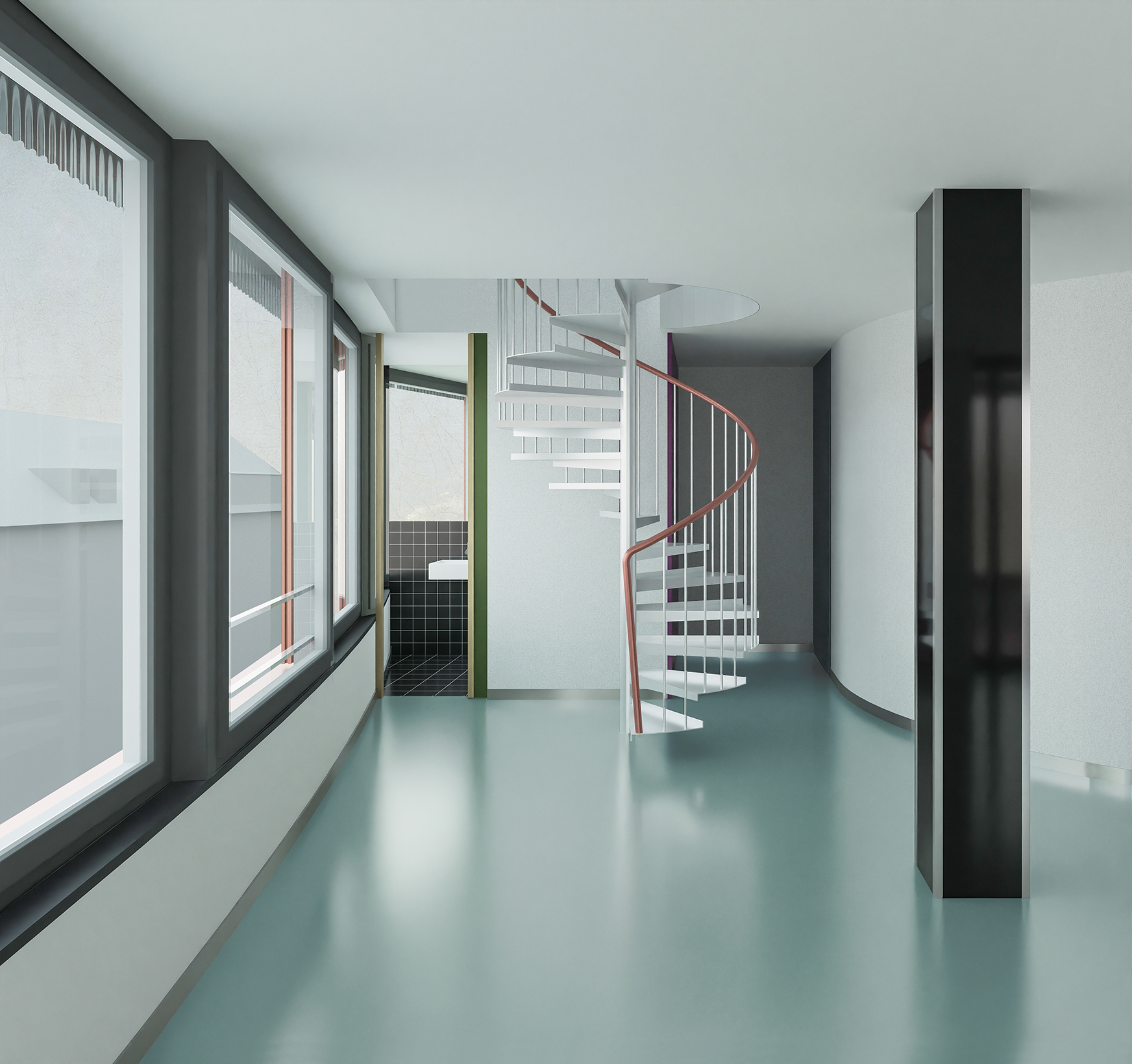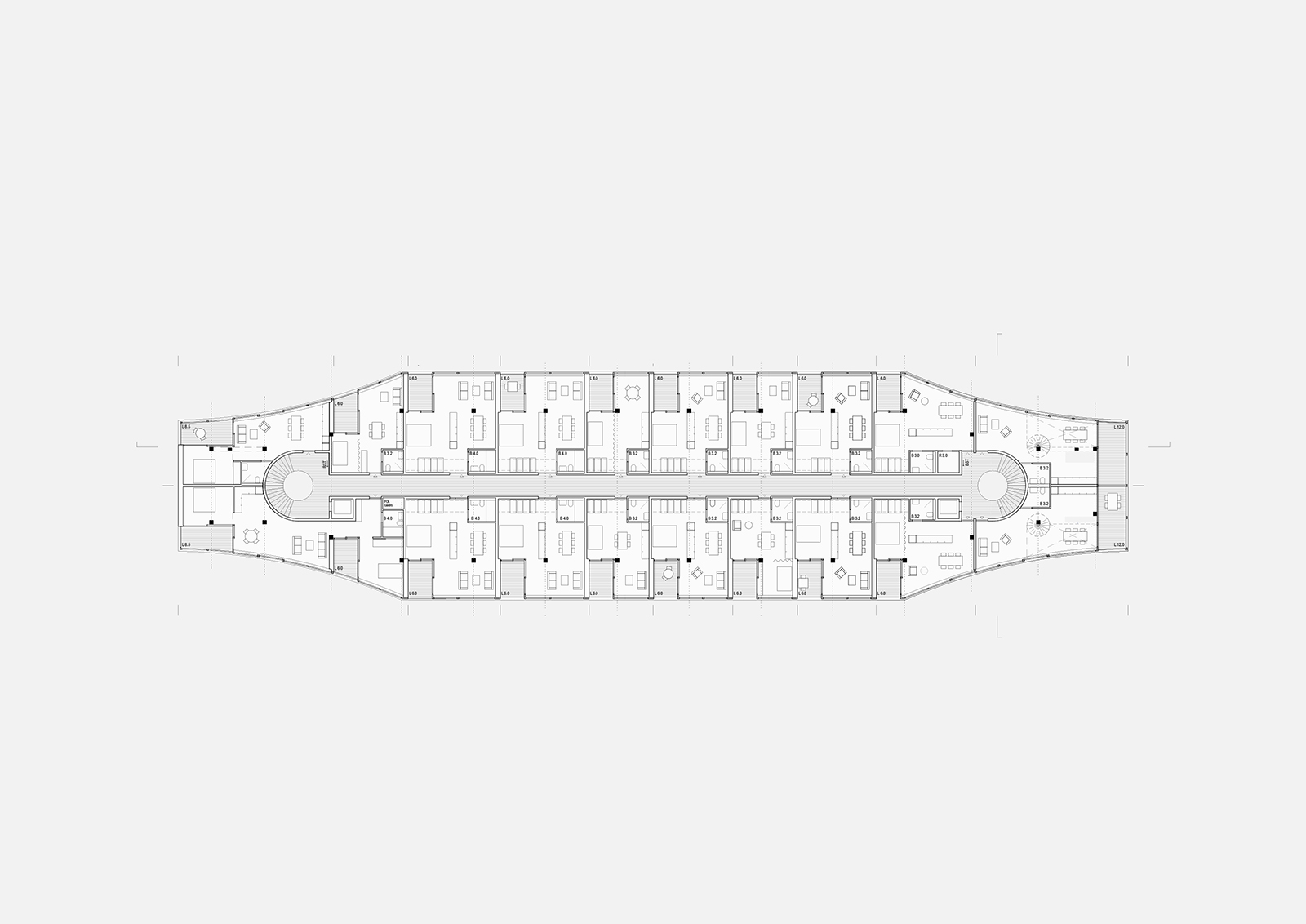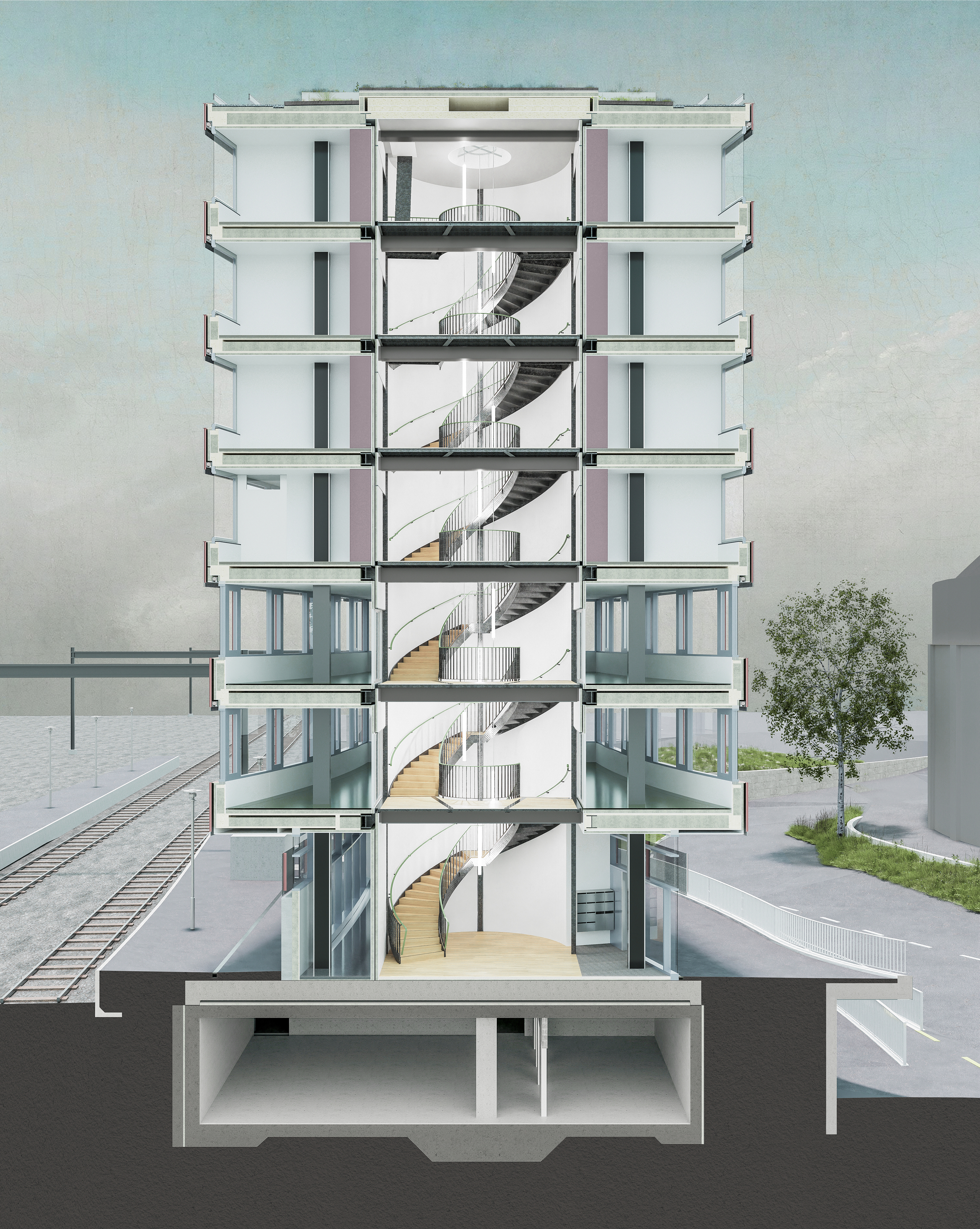 An den Interieurs der luxuriösen Schlafwagen von einst fasziniert uns die Kombination von grösstem Komfort und grösster Effizienz. Auf knappstem Raum finden sich da Wohnräume mit tiefen Sesseln, Klapptische im Licht von Schirmlampen, Garderoben, Schrankabteile, Alkoven zum Schlafen und Badezimmer. Während vor dem Fenster die Welt vorbeizieht, sitzt man behaglich im Sessel und hängt seinen Gedanken nach. Könnte nicht genau dies der Vorstellung vom Wohnen im Micro-Apartment hoch über den Gleisen entsprechen? Nomadisch, mit leichtem Gepäck, aber mit hohem Komfortanspruch und mitten drin im städtischen Geschehen, dessen Geräuschkulisse gedämpft bis ins Innere der Wohnung dringt. Auf dieser ‚Erzählung’ baut die Konzeption der Wohnungen auf. Die Wohngeschosse sind Eisenbahnwagen nachempfunden. So wie die Wagen auflagern zwischen zwei Drehgestellen, so sind die Wohngeschosse aufgespannt zwischen zwei runden Treppenhäusern. Ein breiter Mittelgang verbindet sie und erschliesst die beidseitig aufgereihten Abteile der Wohnungen. Diese werden von einem zentralen Möbelkorpus zoniert, ohne dass dadurch die räumliche Kontinuität des Allraums fragmentiert würde. Geschützt von einer tiefen Loggia, bildet der introvertierte Schlafbereich eine dämmrige, verschwiegene Höhle, während der extrovertierte Wohnbereich zu einem eigentlichen Ausguck wird. So kommen auf knappstem Raum verschiedenste Wohnwelten zusammen. Drehbare Schränke, Türen mit Zapfenbändern und Vorhänge in endlosen Schienen regeln die räumlichen Verhältnisse und erinnern an die mechanischen Verwandlungskünste von Schlafwagen-Interieurs.