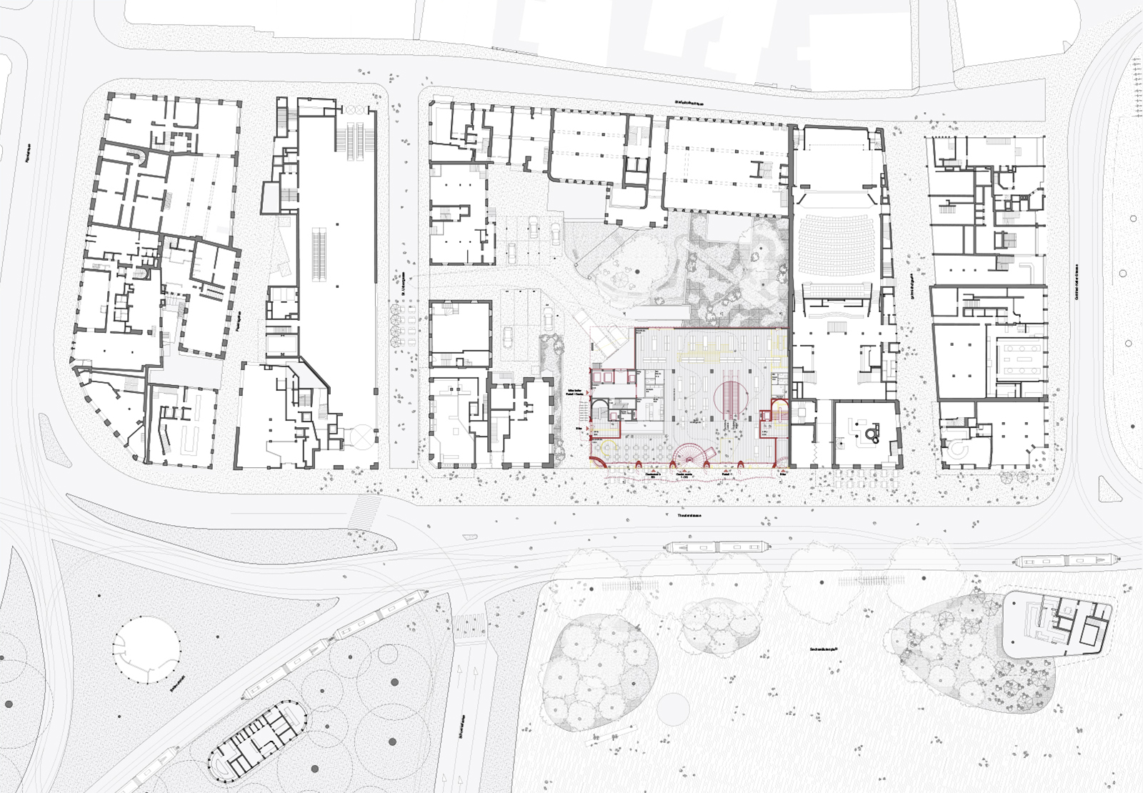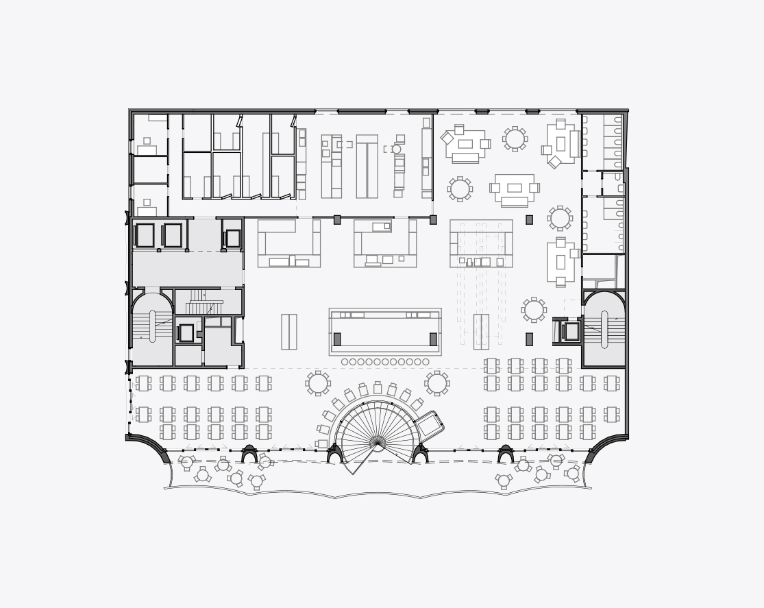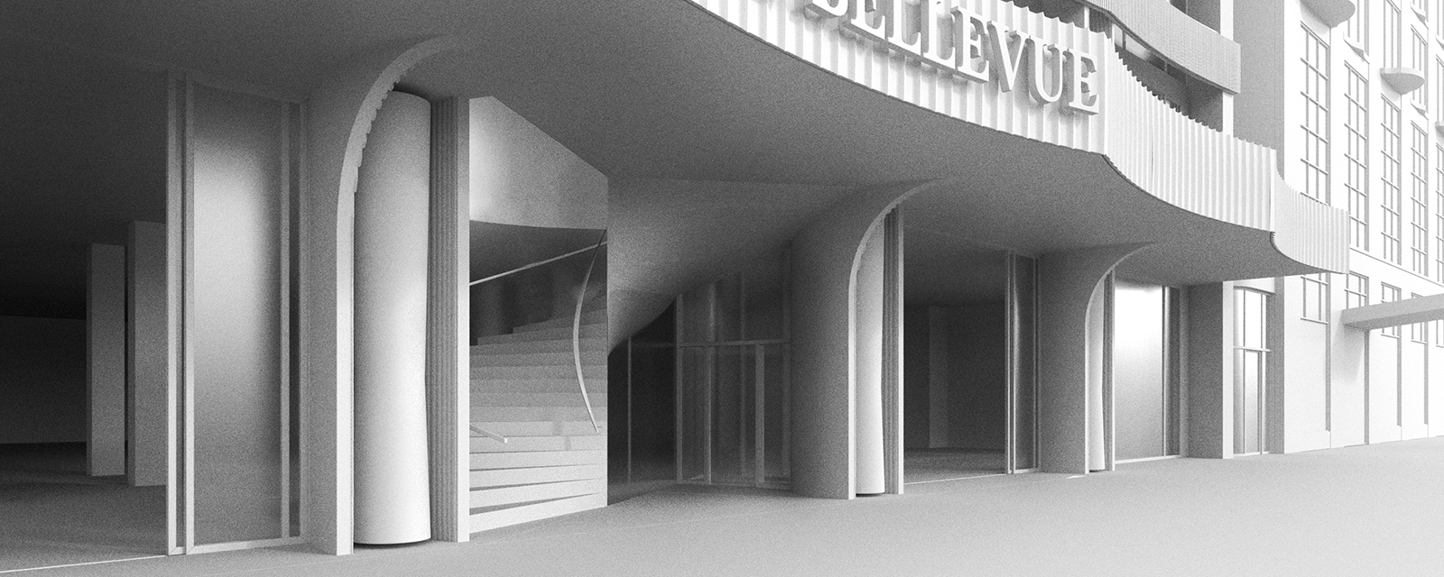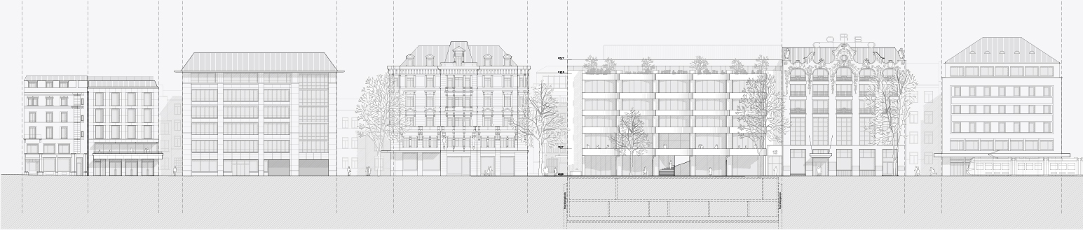 geschoss künstliche Licht- und Luftwelten zu installieren zu können. Wie verlustreich dies für den öffentlichen Raum ist, dafür ist das heutige Haus in seiner selbstbezogenen Stummheit ein besonders beredter Zeuge. Darum schlagen wir vor, das ausladende Vordach, das heute bloss Leuchtschriften trägt, als eigentliche Stadt-Terrasse aufzuwerten. Diese ist über die grosse Wendeltreppe direkt mit dem Stadtraum verbunden, gewährt den Besuchern einen erhöhten Ort der Rast über dem Treiben auf der Strasse - und den Passanten darunter Wetterschutz und Schatten für das Café im Parterre. Wir haben dabei die heitere Stimmung unter den Markisen des Café Kranzler in Berlin vor Augen, die populäre "Storchen"-Terrasse über der Limmat oder die