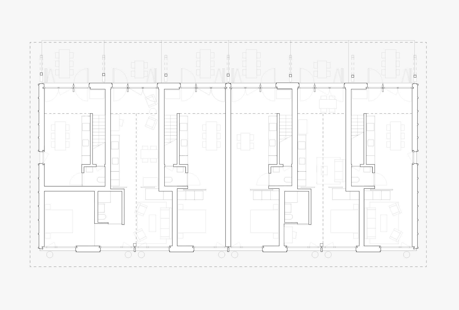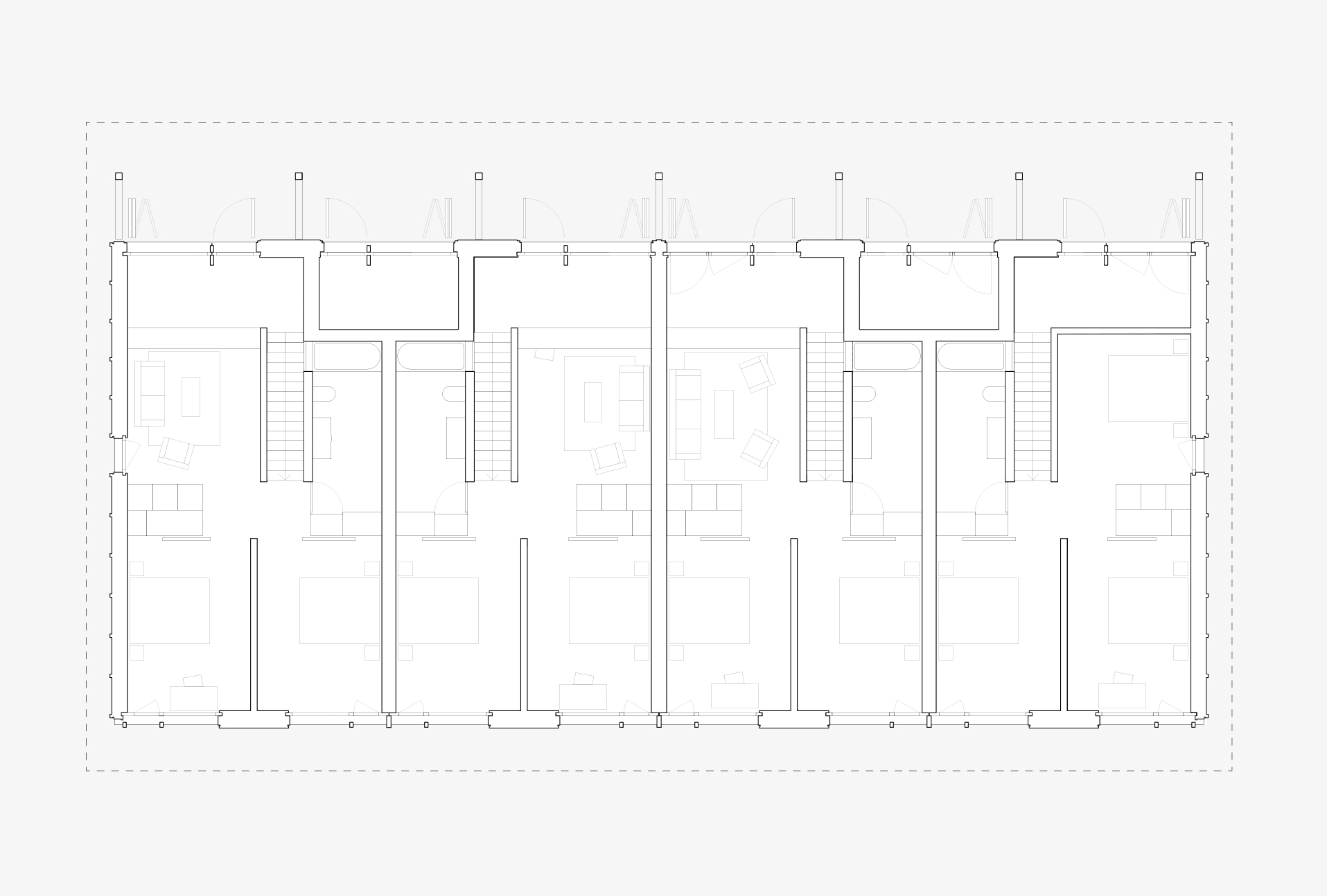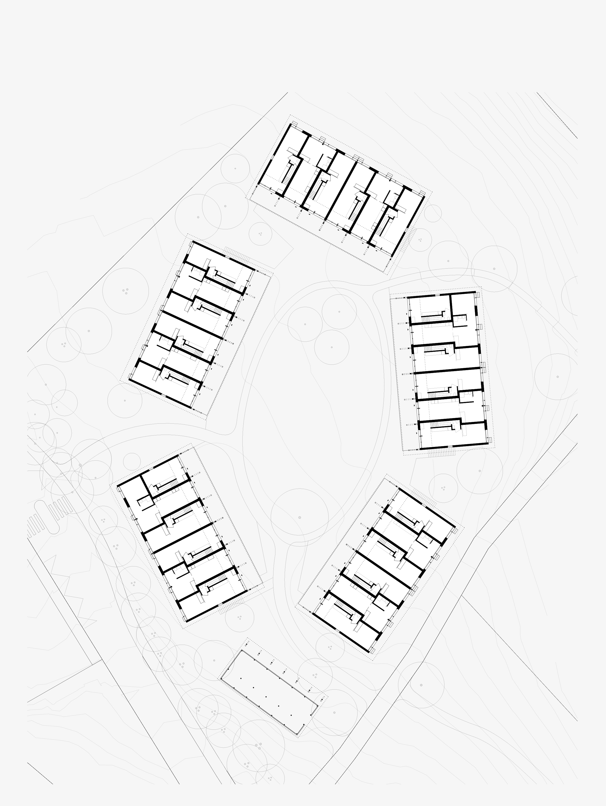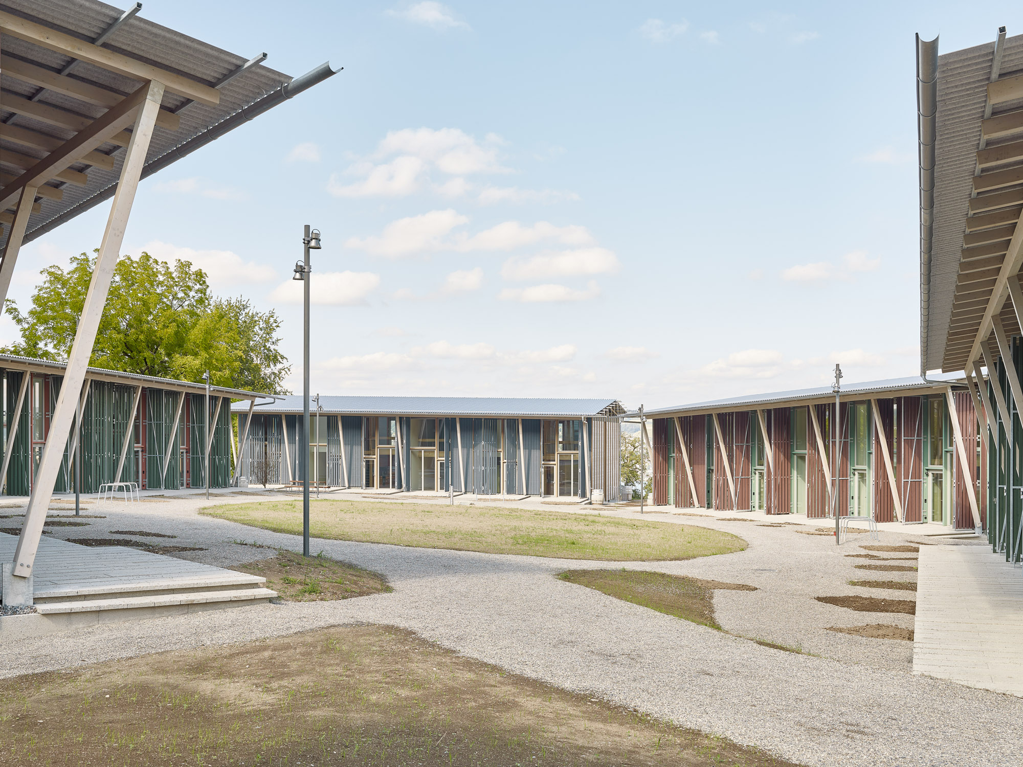 Die Baukörper vereinigen unter ihren weit ausladenden Dächern eine bunte Mischung von Wohnungen. Diese sind komplementär ineinander gefügt und thematisieren so räumlich das Zusammenleben unterschiedlicher Lebensformen.