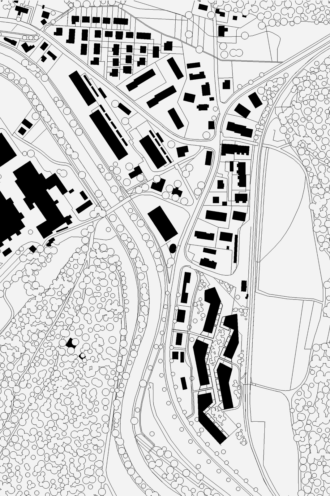 Politisch gehört Sennhof zur Stadt Winterthur, geografisch aber ist der Vorort klar vom Stadtgebiet getrennt und bildet eine dörfliche Exklave im Tal der Töss. Der Fluss formt nicht nur die Topografie, er richtet auch die Elemente der Besiedlung in Fliessrichtung aus: Gebäude, Strasse, Bahntrasse, Waldkanten. Dies gilt auch für Baukörper und Freiräume der neuen Siedlung Oberzelg, das eingeschnürt zwischen Kantonsstrasse und Bahnlinie liegt.