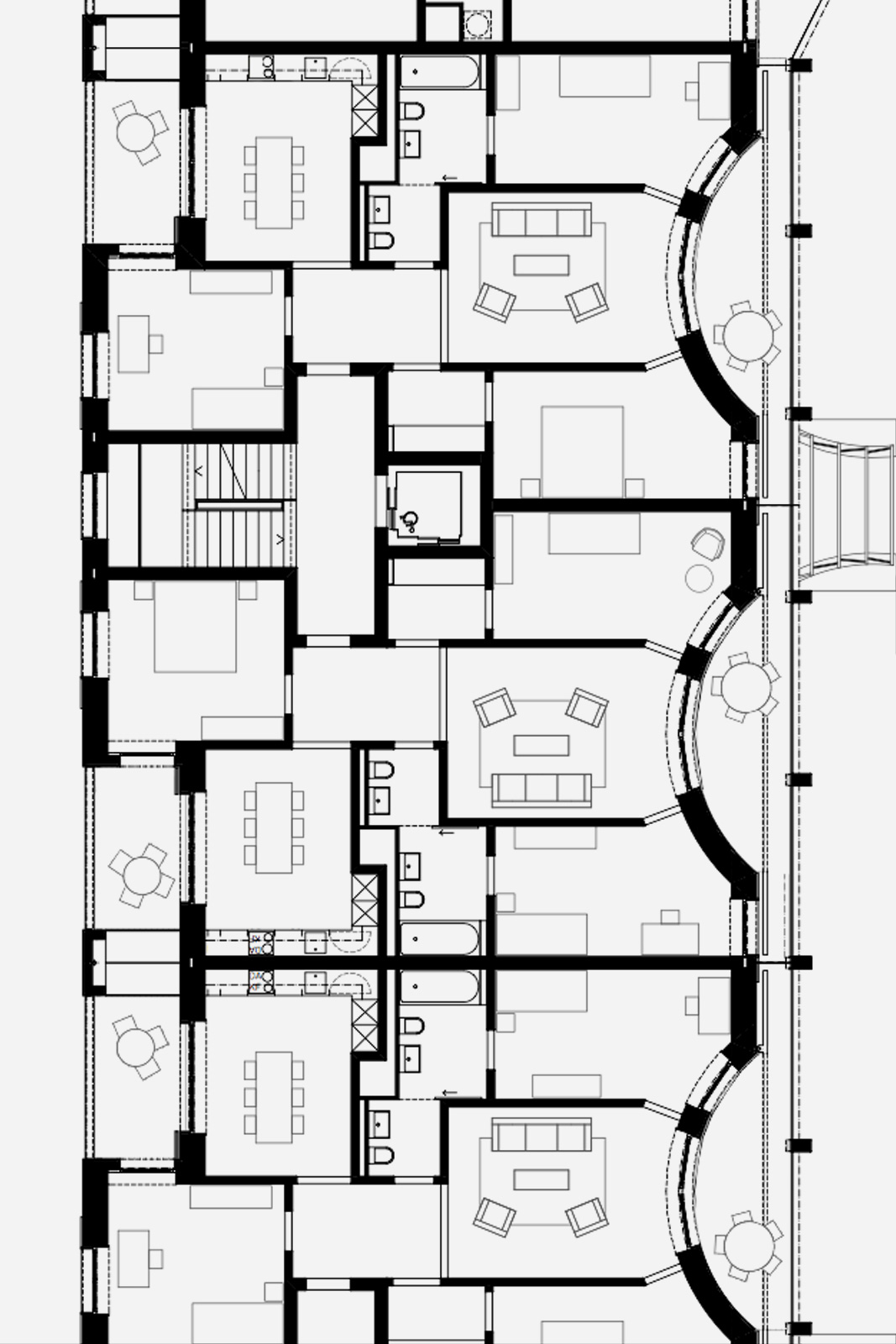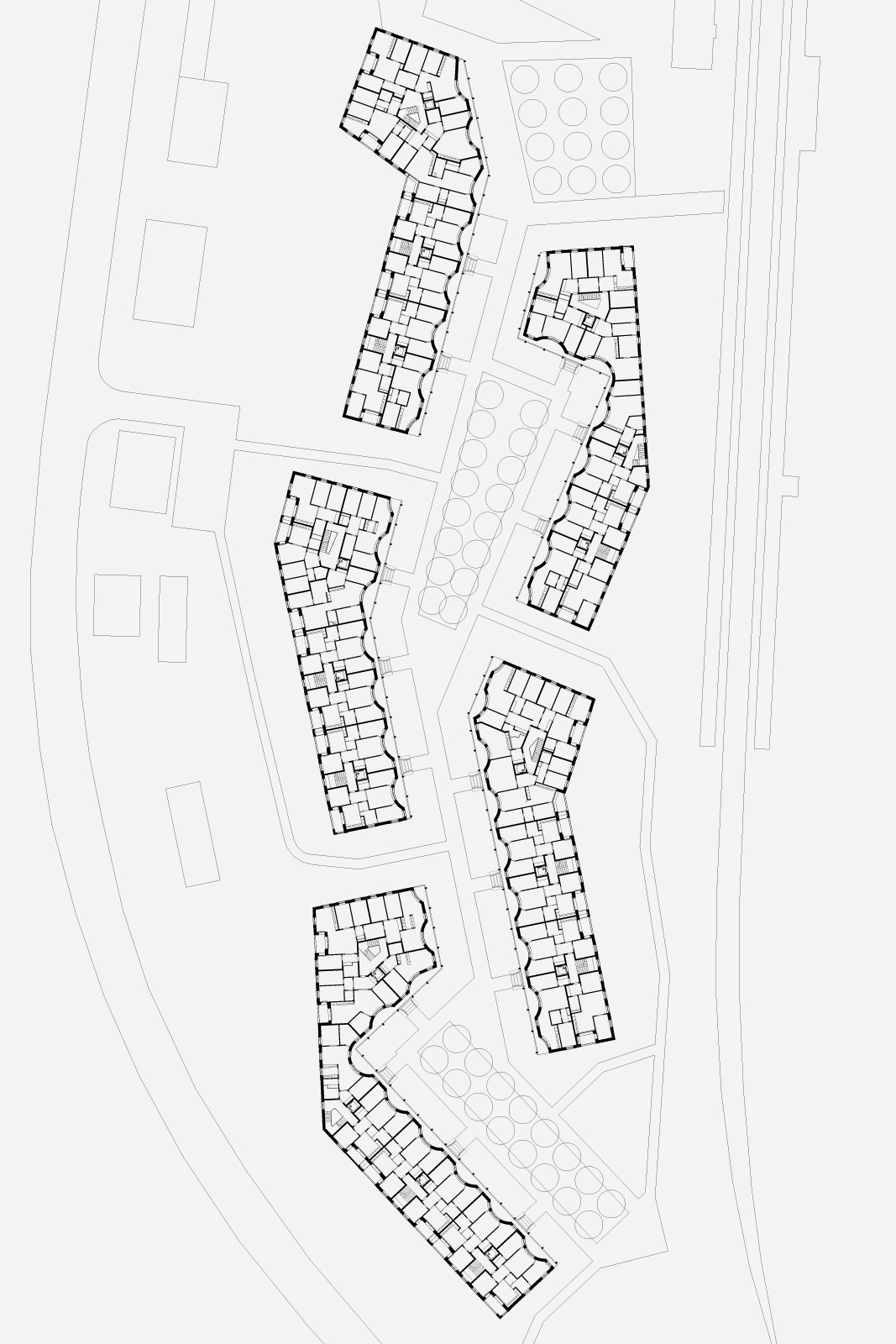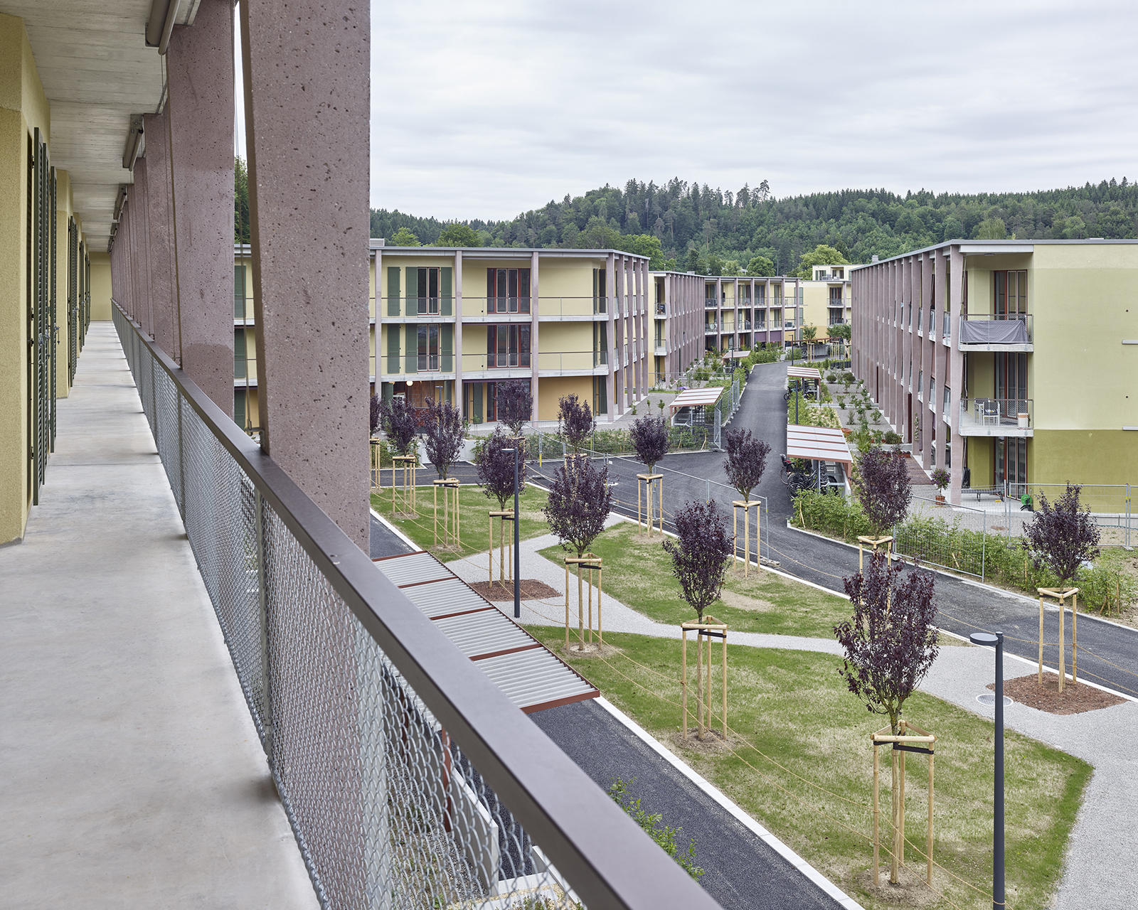 Für Esch Sintzel gehört der Auftrag in Sennhof zu den wenigen, in denen es nicht um Verdichtung geht, sondern um eine Neuplanung auf der grünen Wiese. Statt die bestehende Identität des Ortes zu schärfen, gilt es hier, eine neue – vorstädtische – Identität zu entwickeln. Darum ist dieses Projekt von den öffentlichen Räumen her konzipiert, und darum sind diese öffentlichen Räume besonders explizit als städtische Aussenräume angelegt, die als Folge von Plätzen und Gassen zusammenwirken. Die Plätze werden von luftigen Loggien und erhöht gelegenen Privatgärten gefasst, um zur individuellen Aneignung einzuladen und einen festlichen Rahmen für das Zusammenleben in der Siedlung zu schaffen.
