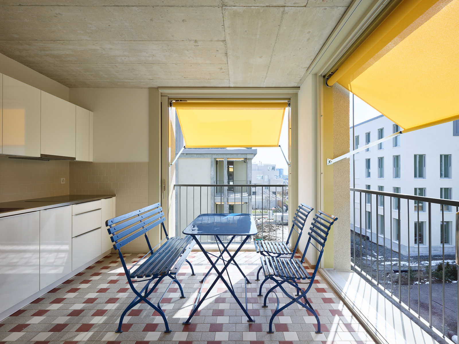 In contrast, the small apartments in the other building are trimmed to utmost efficiency. Instead of loggias there are large sliding windows at the corners. In order to create localized spaces for the rolling windows the exterior wall is offset outwards. By this means the motion of the window creates a motion in the surface of the facade, which becomes plastically structured solely through this spatial layering.