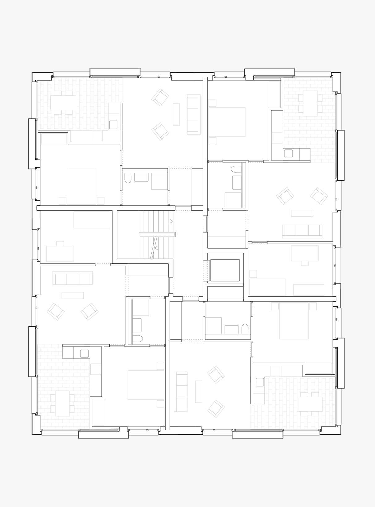 The remits for the two apartment buildings by Esch Sintzel are entirely different: high-status and lavish versus radically reduced and cost-efficient. This resulted in the derivation of two fundamentally distinct typological concepts: a centripetal (aligned towards an inner middle) ground plan for the larger apartments, a centrifugal (moving away from the middle) one for the smaller apartments.