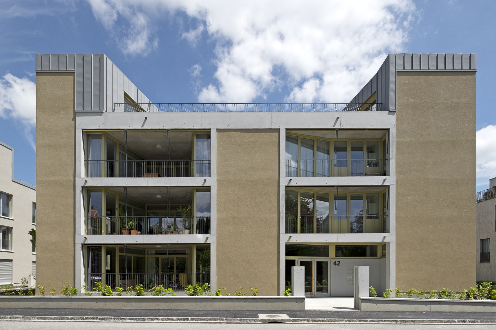 In contrast, the small apartments in the other building are trimmed to utmost efficiency. Instead of loggias there are large sliding windows at the corners. In order to create localized spaces for the rolling windows the exterior wall is offset outwards. By this means the motion of the window creates a motion in the surface of the facade, which becomes plastically structured solely through this spatial layering.
