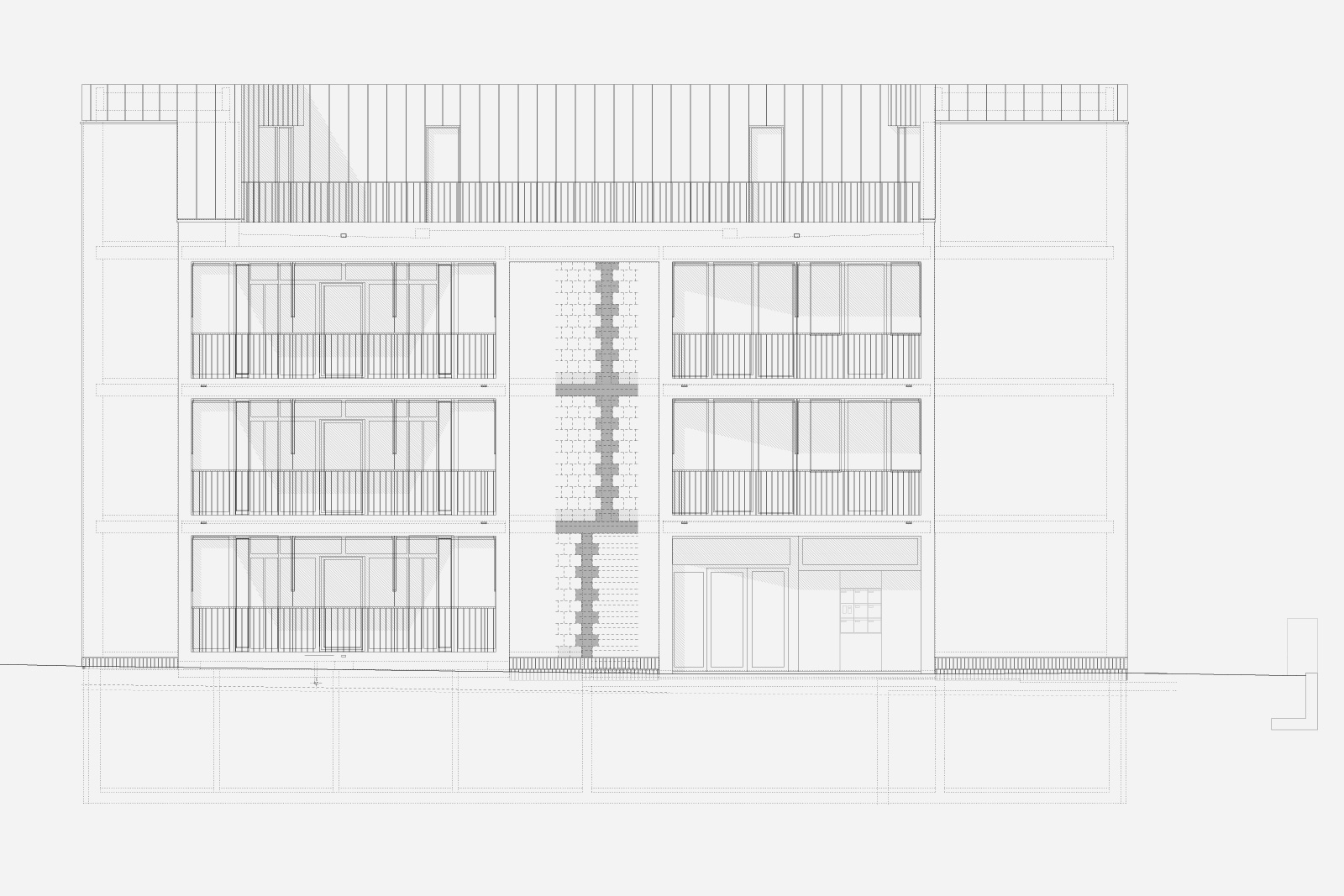 The bourgeois central living-hall served as a typographical model, directed towards an inner middle and therefore avoiding encounters with the immediate neighbours. In each apartment three loggias span the threshold spaces between the private and public worlds.