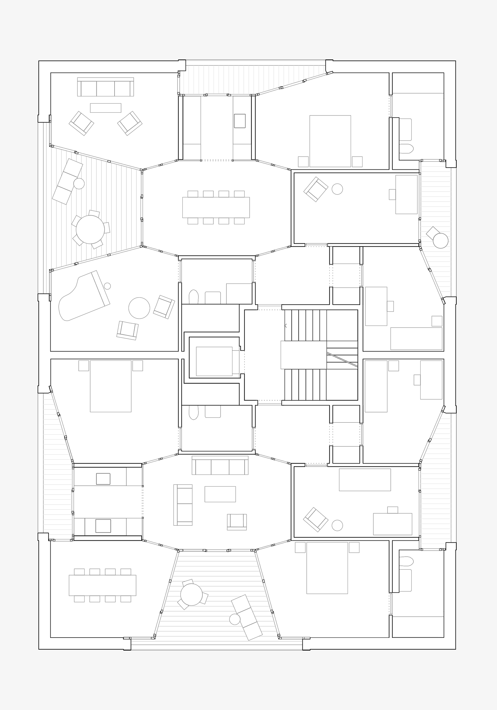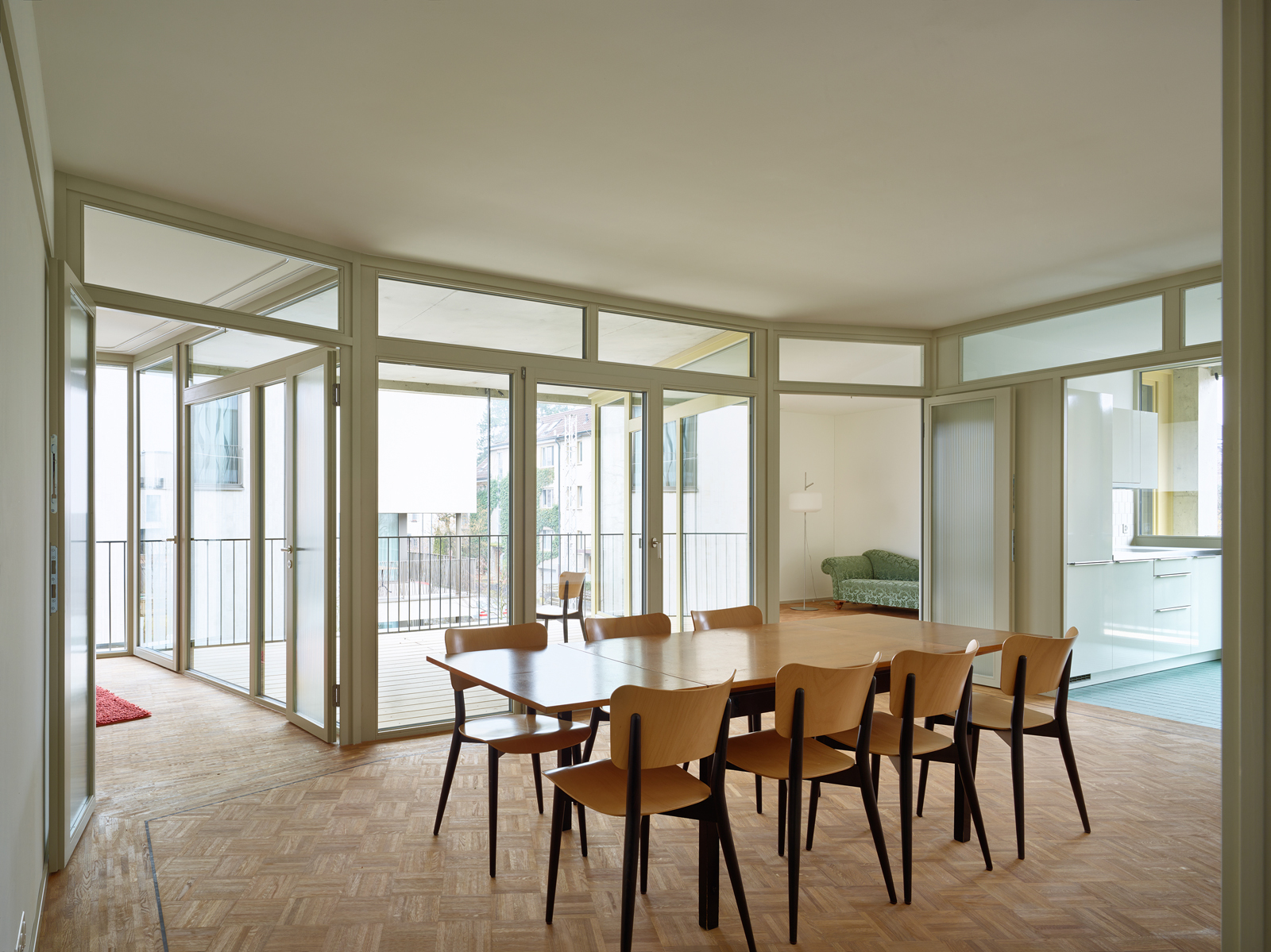 The remits for the two apartment buildings by Esch Sintzel are entirely different: high-status and lavish versus radically reduced and cost-efficient. This resulted in the derivation of two fundamentally distinct typological concepts: a centripetal (aligned towards an inner middle) ground plan for the larger apartments, a centrifugal (moving away from the middle) one for the smaller apartments.