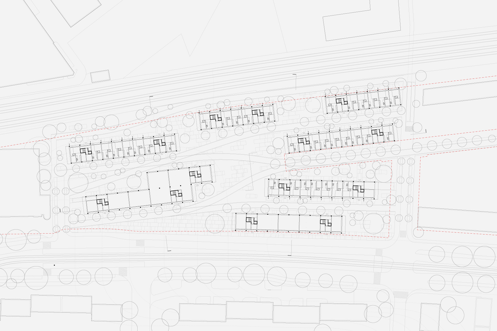 Today it is the railway that largely dominates public perception of the site. The strict rows of variously laden freight wagons on the nearby shunting yards act as a stimulation to arrange the buildings similarly.